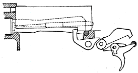 ![]() 枪机后端上抬,与机匣的闭锁支承面解脱,枪机开锁 |