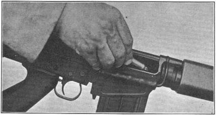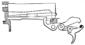 松开扳机后,在扳机簧的作用下,扳机向前转动恢复原位。击发阻铁前端上抬并与击锤轴相摩擦。当扳机完全复位后,击发阻铁的尾端置于扳机后部顶面的凸肩上。由于工作部件后座,压倒击锤,击锤轴的前后卡槽分别为保险阻铁尾端和击发阻铁的前端所卡住,但保险阻铁的尾端卡合得稍迟一点。随后,机框和枪机向前复进到位,保险阻铁前端被压下,其尾端又与击锤轴前卡槽分离。此时,击锤仅被击发阻铁前端卡住。由于击锤轴前卡槽解脱,击锤轴便稍稍向前转动一点,于是迫使击发阻铁在其椭圆形轴孔中向后移动,并压缩阻铁簧。至此,击发阻铁尾端被扳机顶面的凸肩制约,击锤处于待发状态。