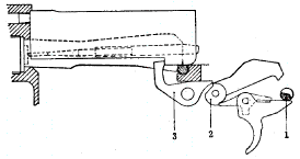发射机构示意图,从左到右分别为“保险”、“全自动”和“半自动”。零件说明:1-快慢机轴;2-击锤;3-保险阻铁(不到位保险)