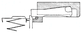 ![]() 枪机复进抵住枪管尾端面,机框继续复进,枪机后端下降,抵在机匣的闭锁支承面上 |