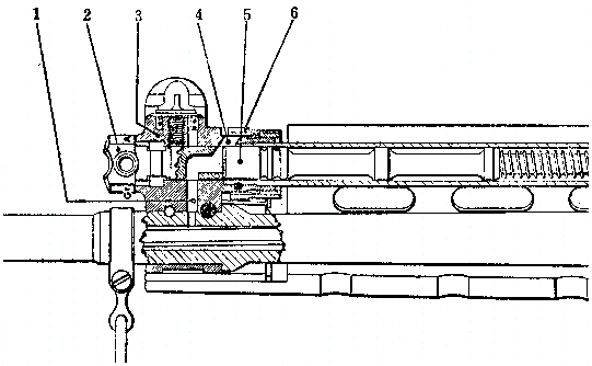 导气装置和气体调节器结构:1-导气孔;2-导气箍顶塞;3-导气箍;4-排气孔;5-活塞头;6-气体调节器