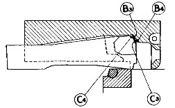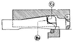 此后,机框上的斜肩B2与枪机上斜肩C2衔合,机框带动枪机一起后座,并借助于铰链结合的机框连杆压缩位于枪托中的复进簧。在此过程中,拉壳钩将膛内弹壳抽出,并将其定位于枪机弹底窝中。击针簧则使击针复位。当枪机弹底窝平面后座至抛壳孔后端面时,弹壳碰及抛壳挺(抛壳挺伸入弹底窝中)面向右抛出。抛壳后,工作部件继续后座,当它们与发射机座相碰时,后座终止。