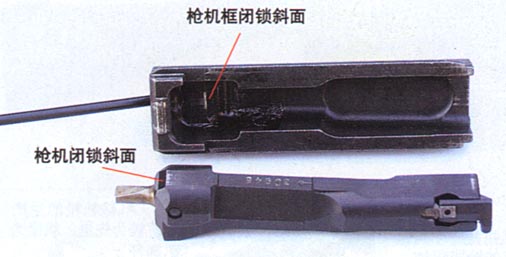 ![]() 弹头出膛瞬间,机框上的开锁斜面与枪机开锁斜面贴合 |