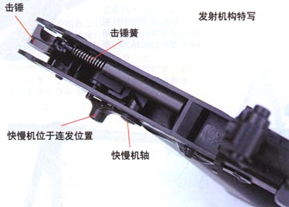 当快慢机装定于“A(全自动)”位置时,快慢机轴上的大缺口对正扳机尾部,扳机可在最大范围内转动。当扣压扳机时,扳机尾部上抬同时顶起击发阻铁尾端,使击发阻铁前端下降,与击锤轴的后卡槽解脱。同时击锤向前转一小角度,被保险阻铁卡住,于是,击发阻铁在自身簧力作用下移至椭圆形轴孔的前端,其尾端从扳机顶面凸肩上滑下。枪机闭锁后,机框仍要向前继续复进一小段自由行程才到位。在此过程中,击针尾再次突出于机框之外。机框底部的凸笋将保险阻铁的前端压下,并且克服保险阻铁的簧力,推保险阻铁向前旋转,保险阻铁尾端与击锤轴的前卡槽解脱。这时,击锤向前回转,借击锤簧的簧力猛击击针,击针打击底火,枪弹击发。