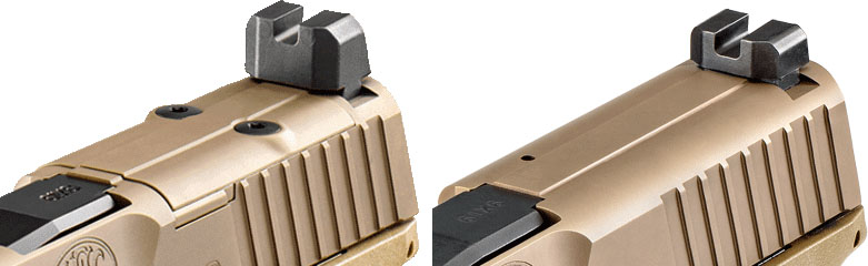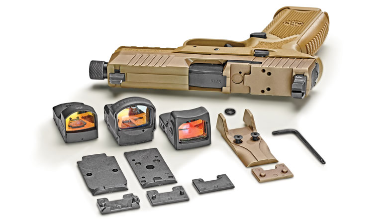另外上述型号都分别有普通型和MRD型,后者在套筒顶部有一块可由射手自己更换的盖板,能换成对应安装不同牌子的小型红点镜(MRDS)的接口盖板(适配器),FN公司把自己的这种MRDS适配器命名为低轮廓光学瞄准镜安装系统(Low Profile Optics Mounting System,简称LPOMS)。比如一把普通的中等尺寸型就叫FN 509 Midsize,而一把套筒顶部有LPOMS的中等尺寸型就叫FN 509 Midsize MRD。