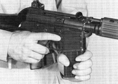 FN CAL在生产工艺上广泛采用钢冲压件,如机匣、前托、、发射机座,弹匣插座等。枪管紧定方式也比较新颖。枪管节套前端成锥形,内有紧定螺纹。装配时,将枪管穿过机匣,自后向前推,枪管节套的锥部与机匣前端面加固部位上的锥部紧密配合,再用螺纹将枪管紧定于机匣前端的锥部。机匣底部有一个与枪管节套底面上的键槽相扣合的键,用以防止枪管转动。当然,采用这种紧定方式后,就无法调整弹底间隙。好在随着现代冶炼技术的发展,材料的磨损大为降低,因此一般步枪的弹底间隙很少需要调整。