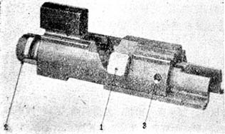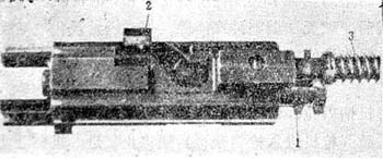 ![]() 闭锁状态(左视图) 1-闭锁断隔螺;2-枪机导柱;3-击针止动销 |