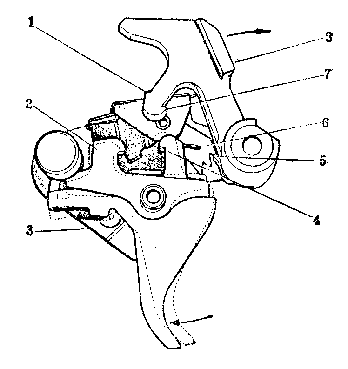 CAL发射机构:1-击锤辅钩;2-后阻铁;3-快慢机柄;4-前阻铁;5-棘爪拨动卡笋;6-三齿棘爪;7-击锤主钩;8-击锤。