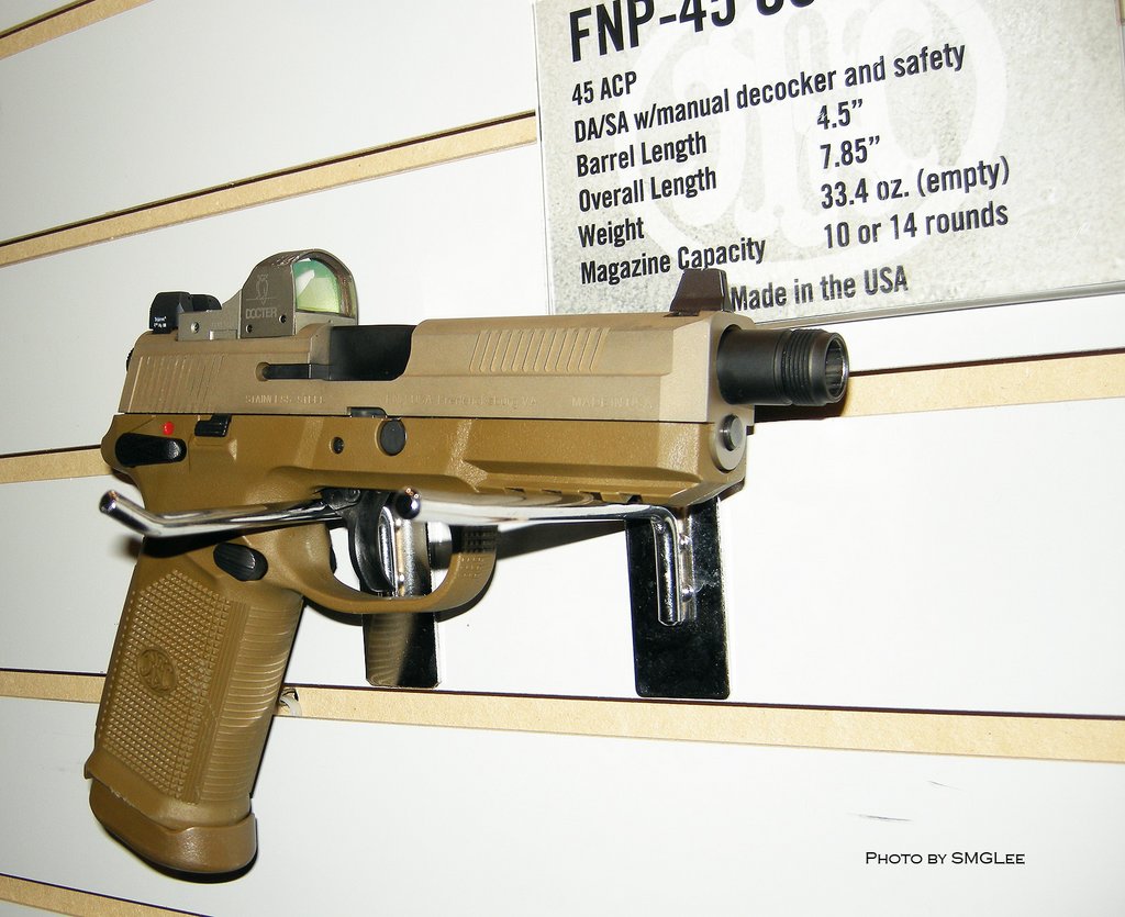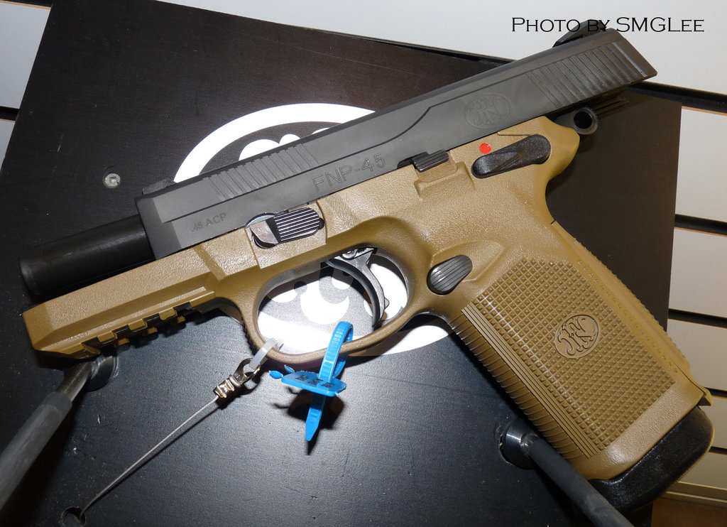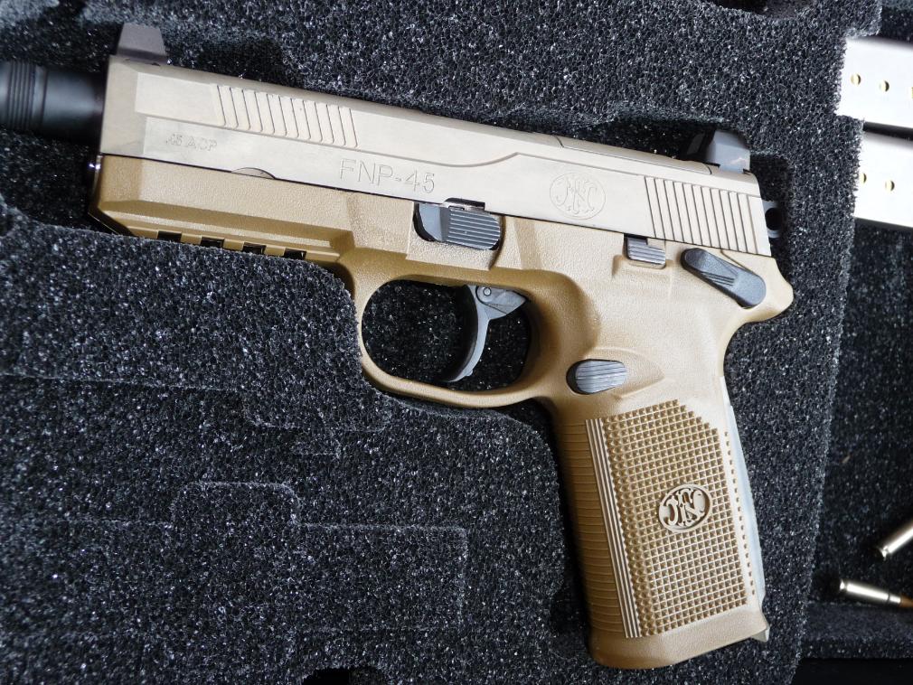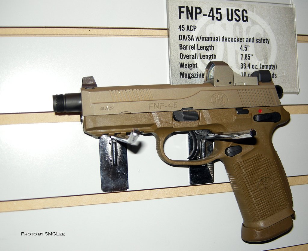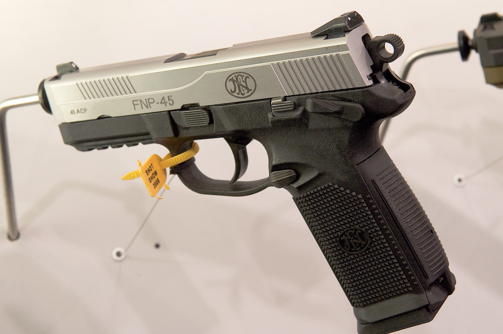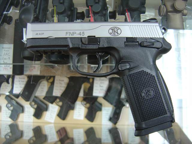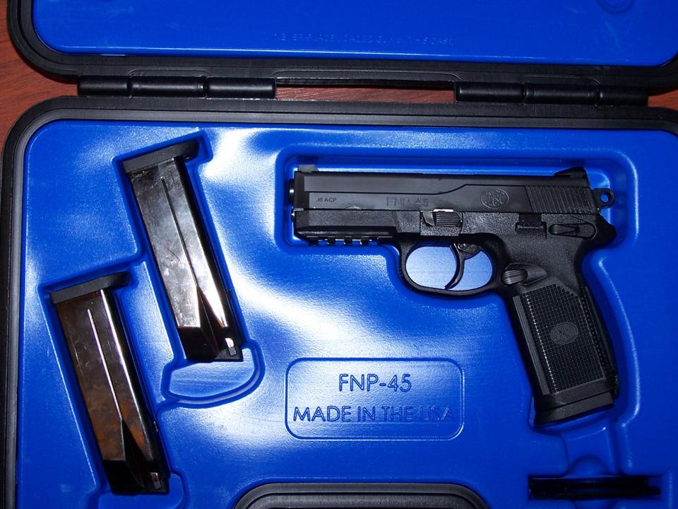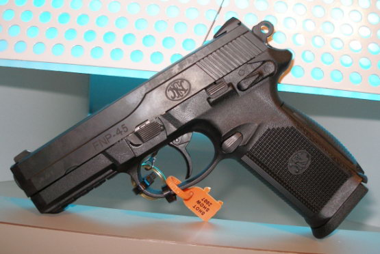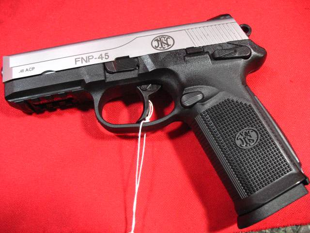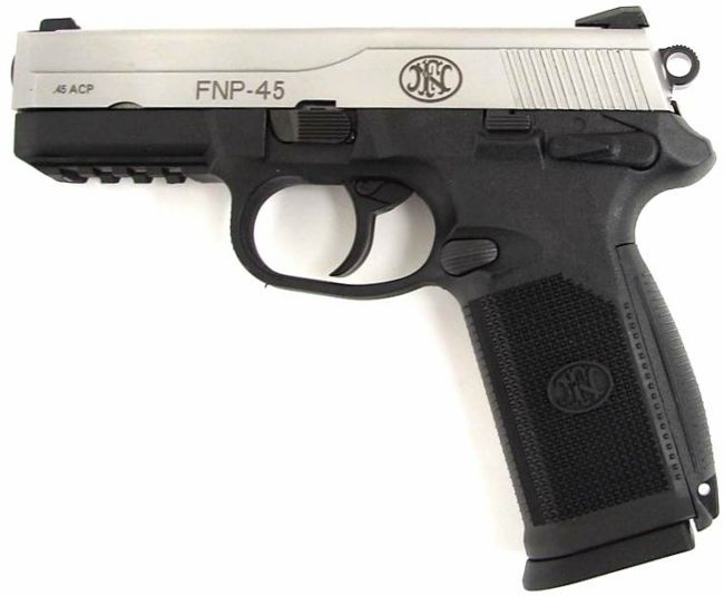 FNP-45手枪是FNP-9/FNP-40手枪的放大型,在2007年首次推出。FNP-45是专门针对美国的.45 ACP口径手枪民用市场和执法市场,也可能是为了改变FNP系列一直卖得不好的局面,所以专门选择了美国较钟爱的口径为突破口。这是一种标准尺寸的大容量.45自动手枪,部份原因可能是由于美国三军打算再尝试采用这一口径的弹药以寻找超过9×19北约标准弹的停止作用。相同的理由(战斗效能和停止作用)也导致美国一些警察机构和民间拥枪自卫的射手偏爱.45 ACP弹。所以FNH美国公司便在原有的FNP基础上发展了这一种口径的手枪。除了口径不同,FNP-45比FNP-9/FNP-40型略大和略重,但握把底部的形状略有不同,是识别出FNP-45的最好方法。最初公布时的弹匣容量为14发,但后来量产的弹匣容量增至15发。