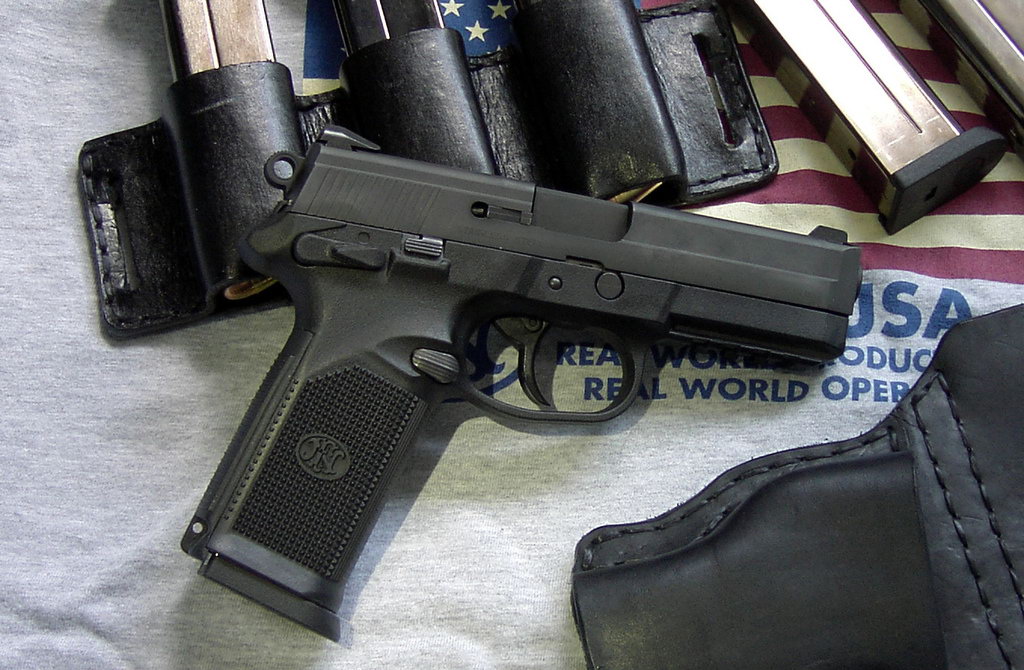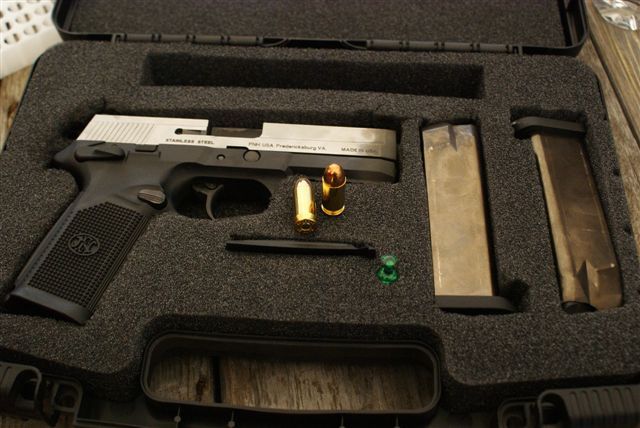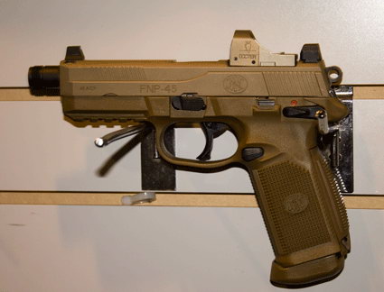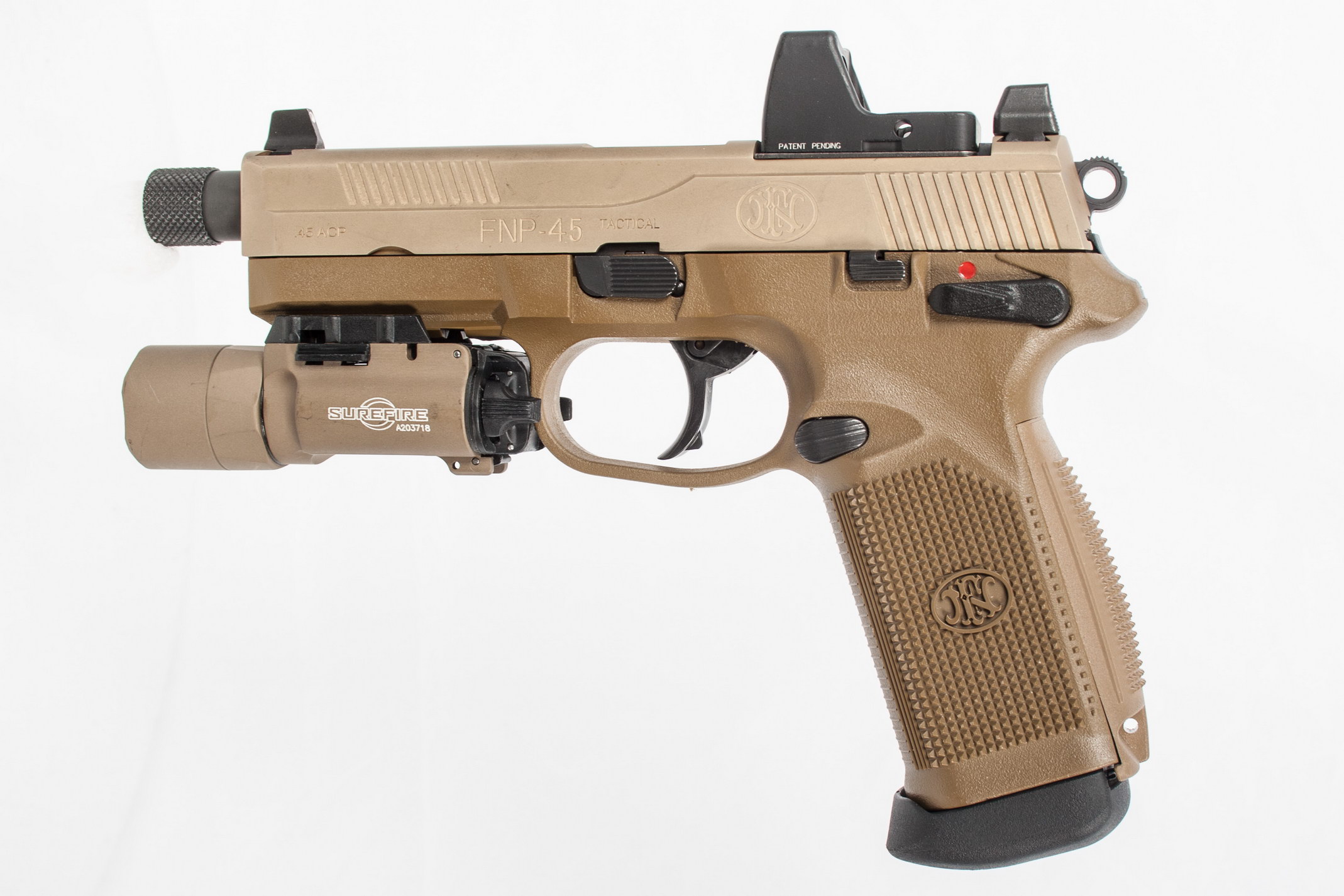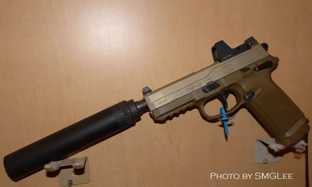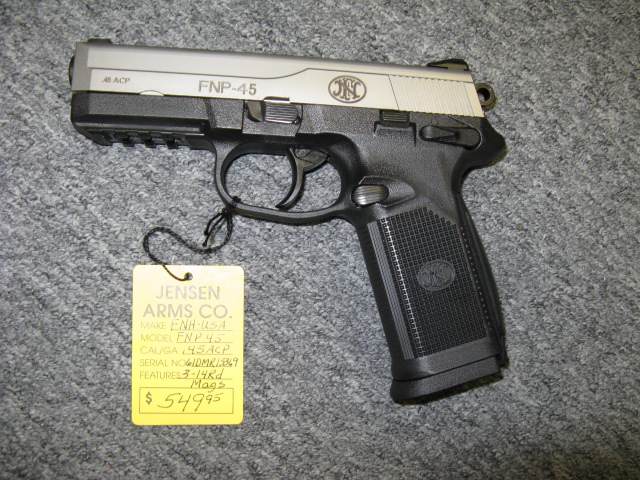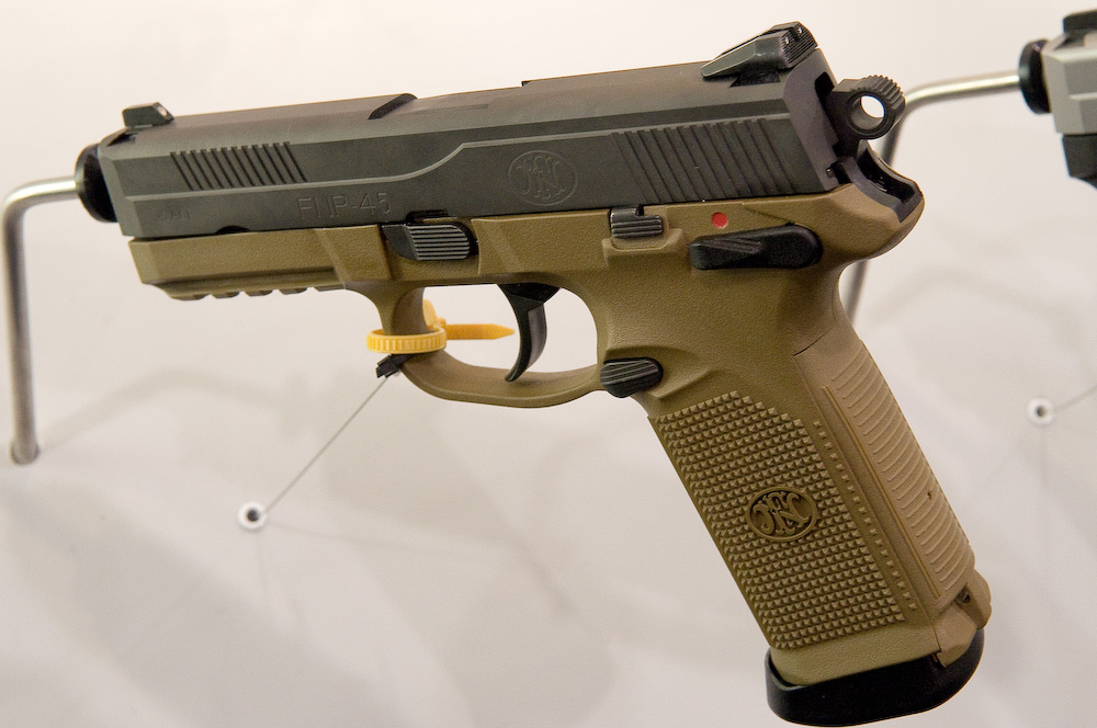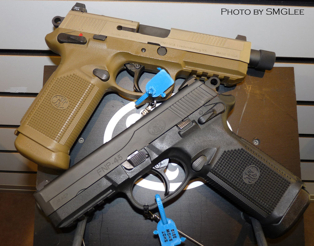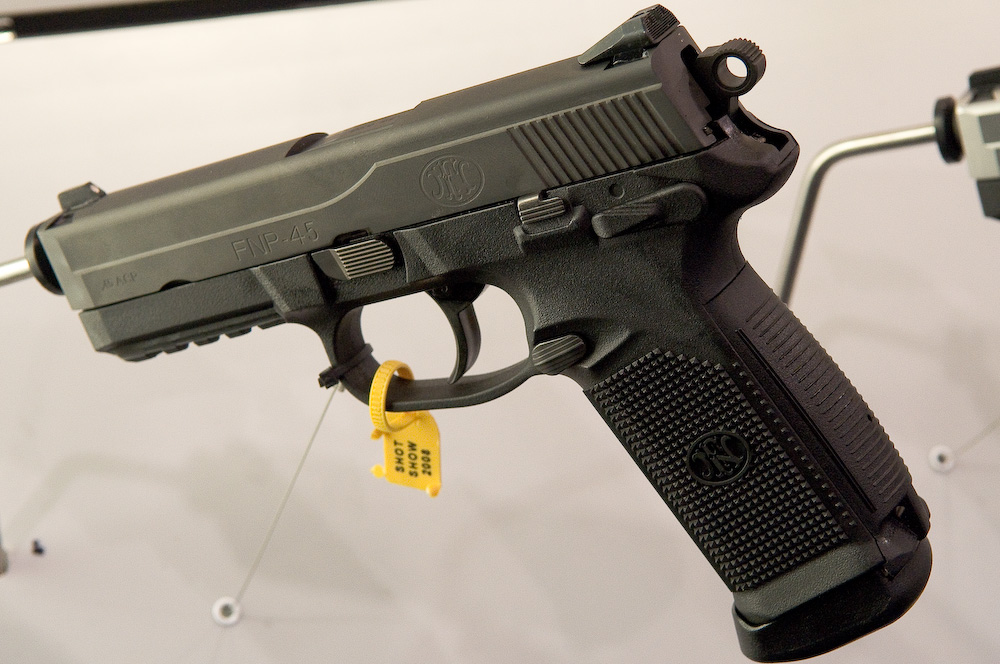 FNP-45手枪是FNP-9/FNP-40手枪的放大型,在2007年首次推出。FNP-45是专门针对美国的.45 ACP口径手枪民用市场和执法市场,也可能是为了改变FNP系列一直卖得不好的局面,所以专门选择了美国较钟爱的口径为突破口。这是一种标准尺寸的大容量.45自动手枪,部份原因可能是由于美国三军打算再尝试采用这一口径的弹药以寻找超过9×19北约标准弹的停止作用。相同的理由(战斗效能和停止作用)也导致美国一些警察机构和民间拥枪自卫的射手偏爱.45 ACP弹。所以FNH美国公司便在原有的FNP基础上发展了这一种口径的手枪。除了口径不同,FNP-45比FNP-9/FNP-40型略大和略重,但握把底部的形状略有不同,是识别出FNP-45的最好方法。最初公布时的弹匣容量为14发,但后来量产的弹匣容量增至15发。
