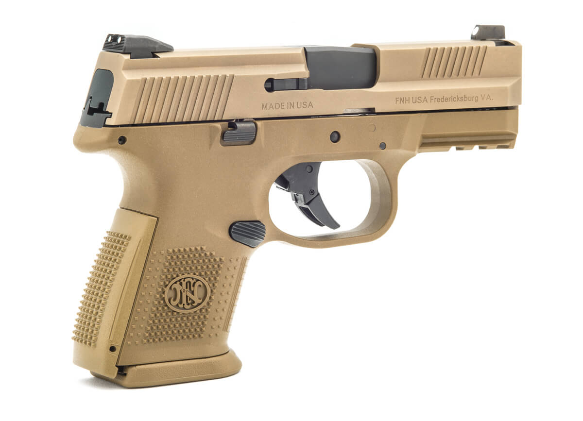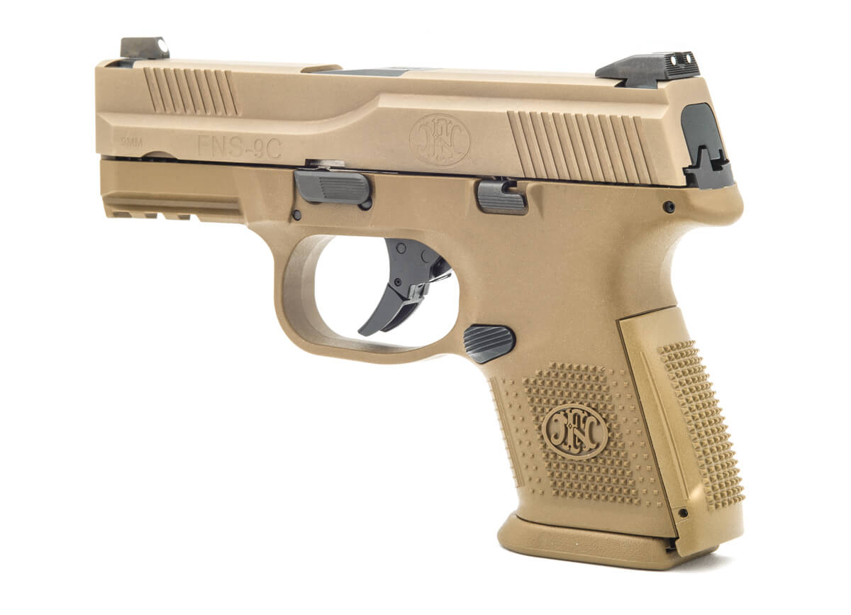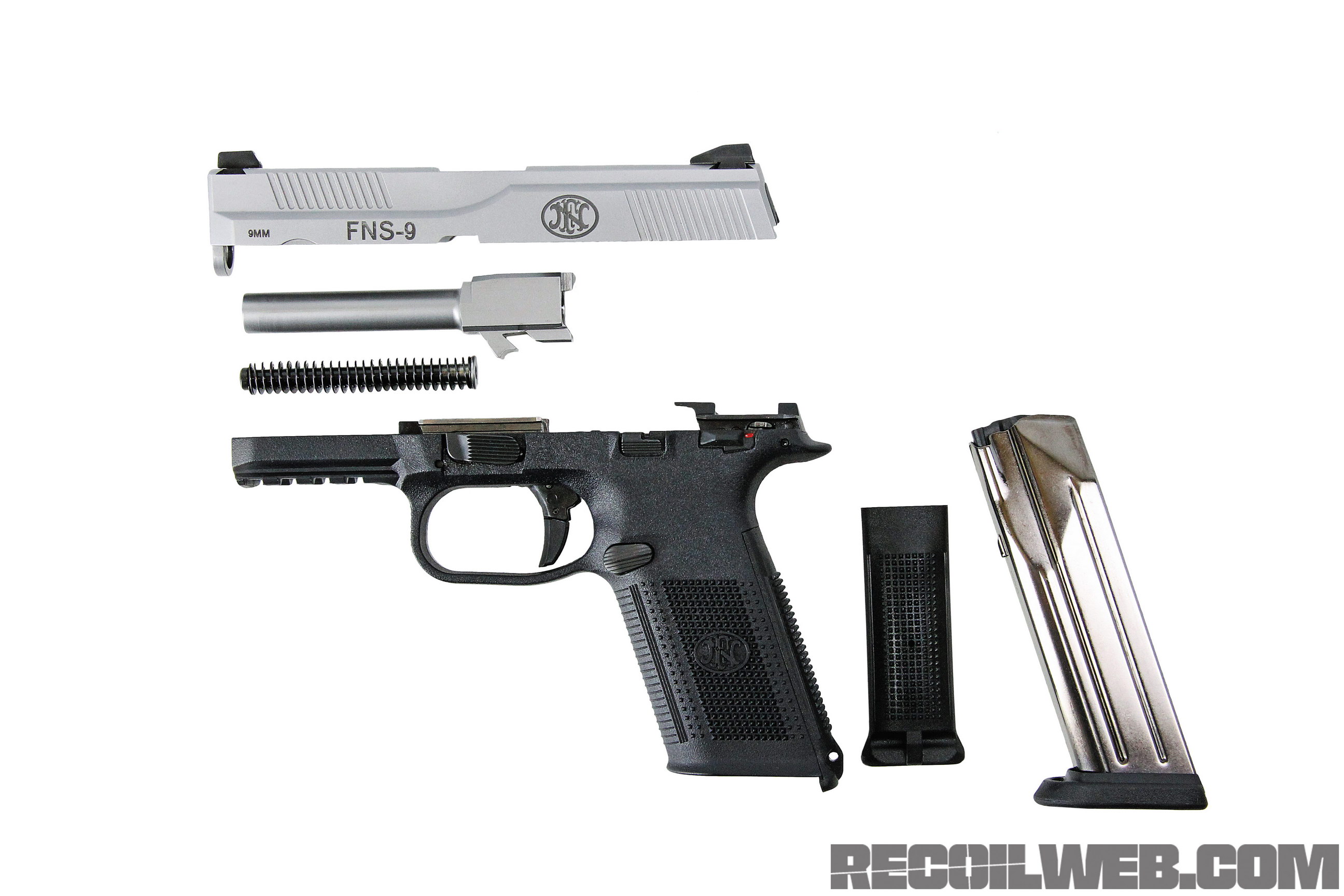 FNS手枪的套筒为钢制,而底把则由聚合物整体注塑而成,和当时流行的手枪一样,FNS系列也采用可改变握把大小的设计——FNS的设计是有一片可由射手自己更换的握把背板。最初推出的FNS系列含有手动保险,但这种纯双动型的击针手枪的手动保险不是必须的,所以后来FN公司推出两种FNS,一类有手动保险,另一类则没有。
