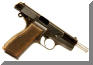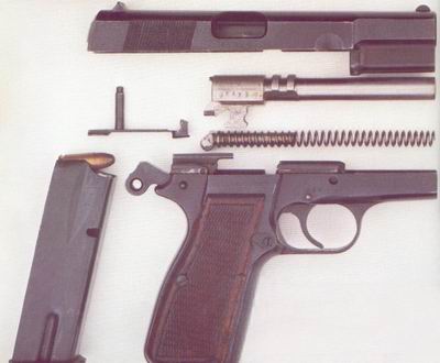 HP手枪采用枪管短后坐式工作原理,枪管偏移式闭锁机构,这种原理与勃朗宁较早时设计的M1911式手枪相同,但结构上作了简化。M1911的枪管采用的是回转铰链式,枪管是在铰链的牵引下而下降开锁的,而HP手枪则采用简单的凸耳式结构,枪管的弹膛下方有一个凸耳,而在手枪底把上通过过盈配合安装有一个与枪管配合的开闭锁突起零件。枪管外表面在位于弹膛上前方处设有两道半环状闭锁突起,卡进套筒内部抛壳口前方的两道闭锁槽内形成闭锁状态,击发时或用手拉动套筒待击时,套筒与枪管一起向后运动约4.7mm自由行程后,弹膛下凸耳与底把开闭锁凸耳的开锁斜面相互作用使枪管尾部逐渐下降,直至枪管上的凸耳在脱离套筒内的闭锁槽从而开锁,然后套筒继续后坐抽出弹膛中的空弹壳并抛出。当套筒后坐到底后,在复进簧的作用下向前运动,套筒推弹上膛,继而推动枪管向前运动,而弹膛下凸耳与开闭锁凸耳的闭锁斜面相互作用,使枪管尾部逐渐抬起,并使枪管上的闭锁突起进入套筒上的闭锁槽内,随后枪管和套筒共同走完自由行程,底把上的闭锁突起抵在枪管下方突起的闭锁支撑面上,完成闭锁过程。