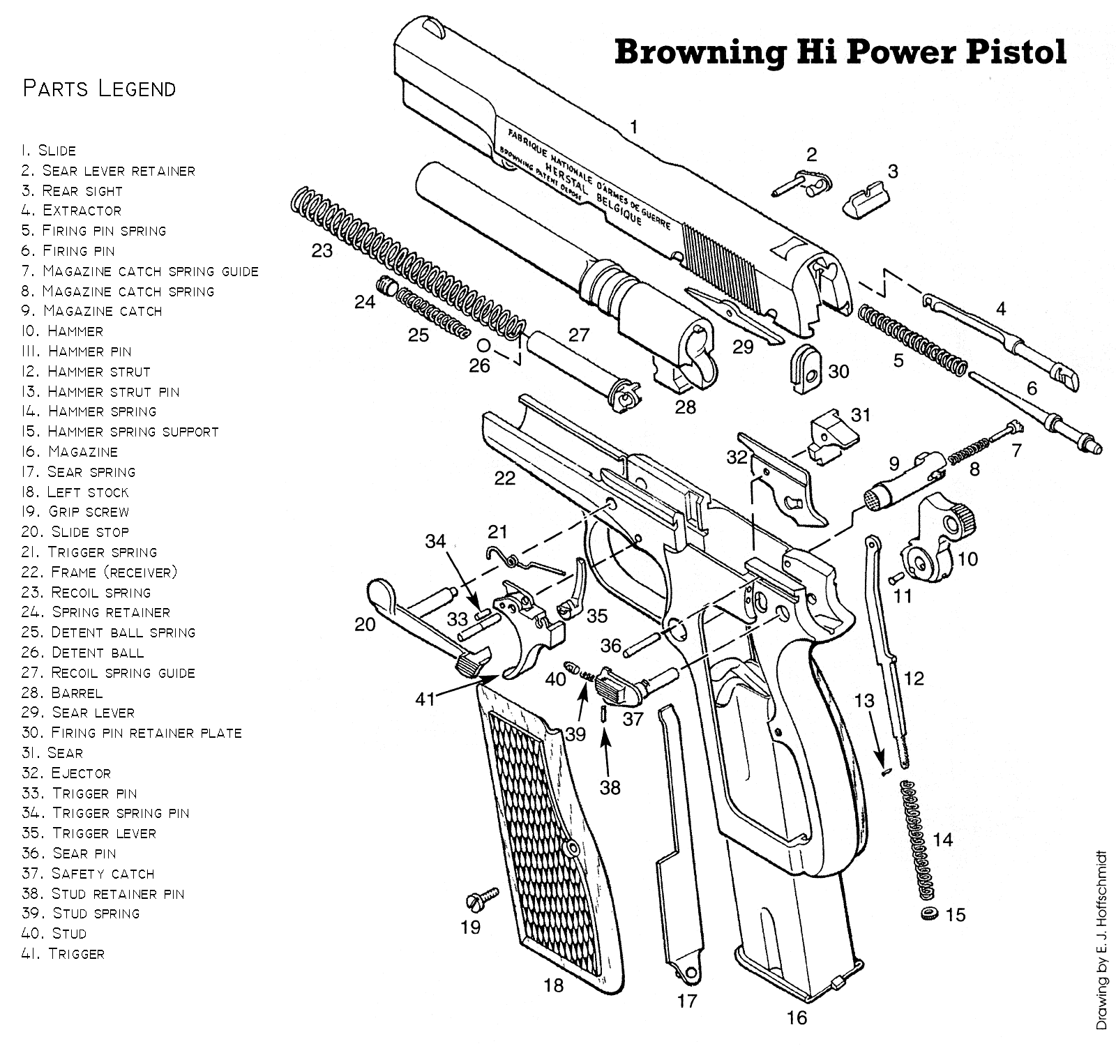 2枪身扣;3-照门;4-拉壳钩;5-击针簧;6-击针;7-弹匣卡笋簧导轨;8-弹匣卡笋簧;9-弹匣卡笋;10-击锤;11-击锤轴;12-击锤压杆;13-击锤压杆销;14-击锤簧;15-击锤簧座;16-弹匣;17-阻铁簧;18-左握把;19-握把螺钉;20-空仓挂机;21-扳机簧;22-套筒座;23-复进簧;24-弹簧限位器;25-惯性缓冲簧;26-缓冲球;27-复进簧导杆;28-枪管;29-阻铁杠杆;30-击针固定拴;31-阻铁;32-抛壳机构;33-扳机轴;34-扳机轴簧;35-击发杠杆;36-击发阻铁轴;37-保险机卡笋;38-定位拴;39-销簧;40-销;41-扳机