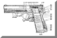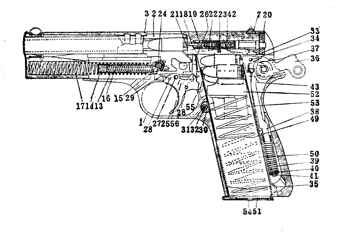 1-套筒座;2-枪管;3-套简;7-表尺(或照门);13-复进簧导杆;14-复进簧导杆帽;15-限位钢珠;16-复进簧导杆簧(空仓挂机簧);17-复进簧;18-击针;19-击针簧;20-击针限制板;21-拉壳钩;22-阻铁杠杆;23-阻铁杠杆铀;例-空仓挂机;25-扳机;26-扳机连杆;27-扳机轴;28一弹匣保险销;29-扳机簧;30-弹匣卡笋;31-弹匣卡笋簧;33-阻铁,34-阻铁轴;35-配铁簧;36-击锤;37-击锤轴;38-击锤顶杆;39-击铰簧;40-击锤簧座;41-击锤顶杆销;42-抛壳挺;43-保险;44-保险机卡销;45-保险机卡销;46-保险机簧;47-右握把盖;48-左握把盖;49-握把螺钉;50-弹匣体;51-弹匣底盖;52-托弹板;53-弹匣托弹簧;54-弹匣底盖固定片;55-扳机-弹匣保险;56一扳机-弹匣保险簧。