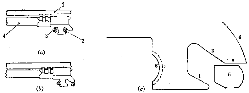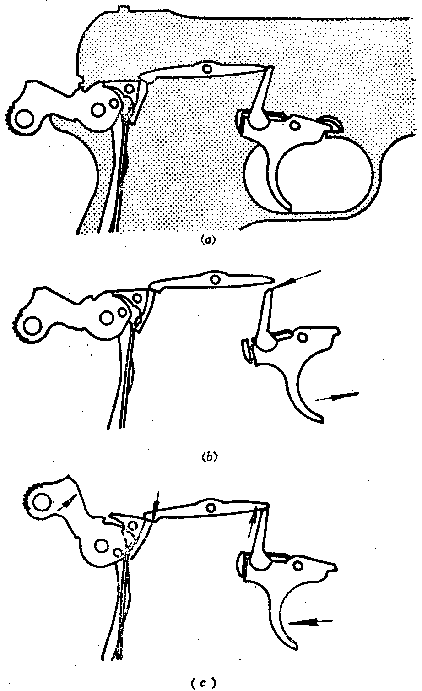 击发机构动作示意图:(a)击发后仍扣住扳机不放;(b)松开扳机;(c)再次扣压扳机