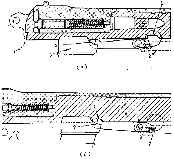 1-套筒缺口;2-复进簧导杆;3-托弹板;4-空仓挂机柄;5-空仓挂机柄销上的凹槽;6-空仓挂机柄销;7-空仓挂机柄簧;8-限位钢珠;9-托弹板突肩。