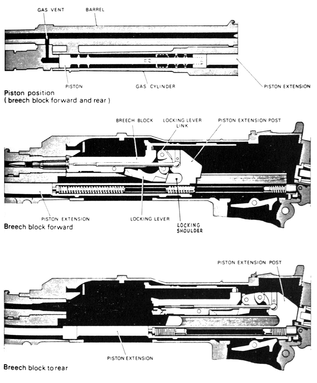 火药气体驱使弹头沿枪膛向前运动,弹头经过导气孔后,一部分火药气体流入气体调节器并作用于活塞头上,活塞/机框组开始后座。由于机框后座,击铁一方面使击针缩入枪机的击针孔内,另一方面又使闭锁连杆向上旋转至垂直位置。至此,弹头亦已出膛而且膛压也下降至安全数值。机框继续向后,闭锁连杆则继续向上旋转,由此使闭锁杆上抬,脱离机匣的闭锁支承面而实现开锁。由于闭锁杆卡在枪机两侧的凹槽内,所以机框通过闭锁杆带动枪机一起后座,压缩复进簧,同时抽壳。一旦弹壳完全离开弹膛,抛壳挺簧即将抛壳挺向前推,抛壳挺撞击弹壳底部上端,使弹壳向下旋转并经由机框的抛壳槽和机匣的抛壳口向下抛出。抛壳后,机框还要后座一段距离,然后撞击缓冲器。在缓冲器作用下,机框向前反跳,开始复进。如果射手此时仍扣压住扳机,则自动循环将一直进行下去。
