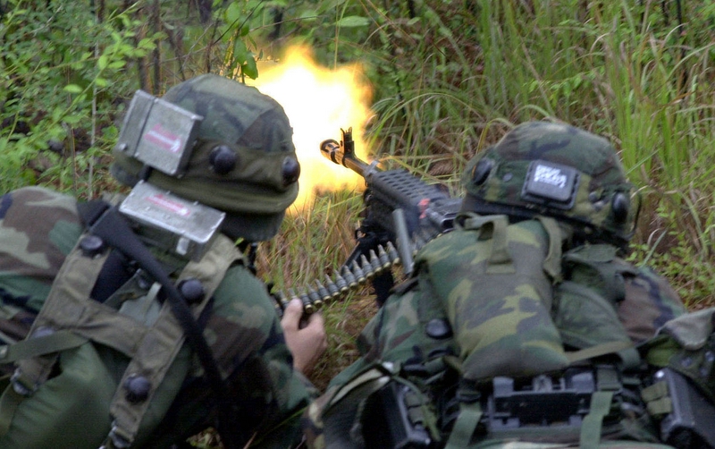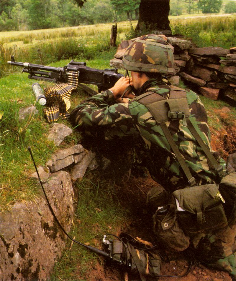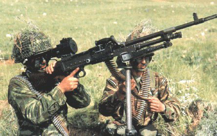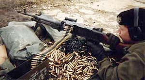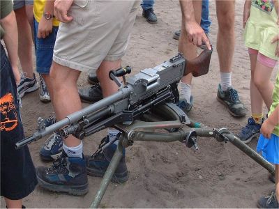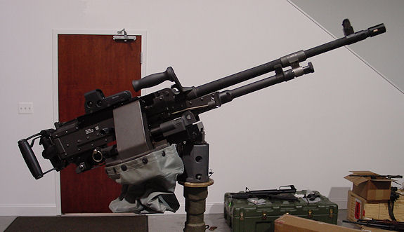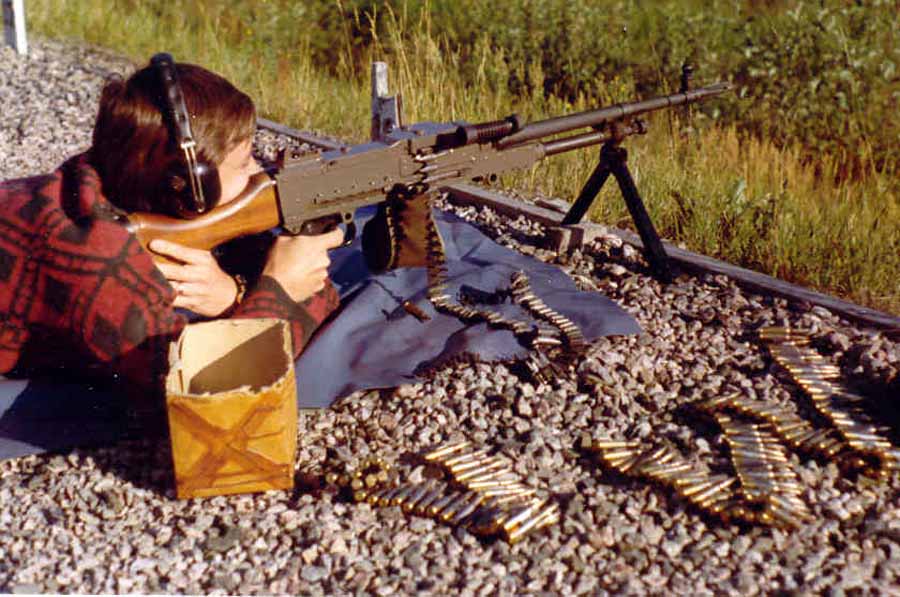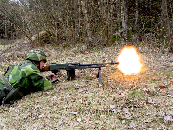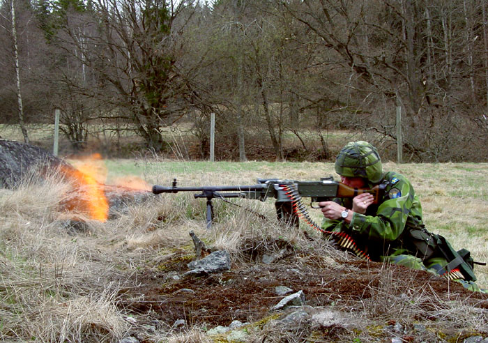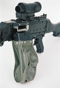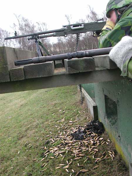 瑞典的Ksp58B使用不可散弹链,因此射击后的空弹链会挂在枪上