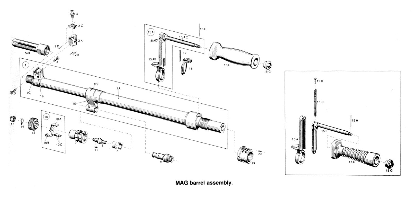 MAG机枪采用气冷式枪管,枪管很容易更换,枪管长545mm,包括消焰器、提把和气体调节器在内重约2.7kg。枪膛和弹膛均镀铬。消焰器形状与M14步枪的相似,用螺纹固定于枪管上。个别国家为他们的MAG机枪增设了一种加厚的重型枪管,比如英国的L7A2,通常用于车载机枪。