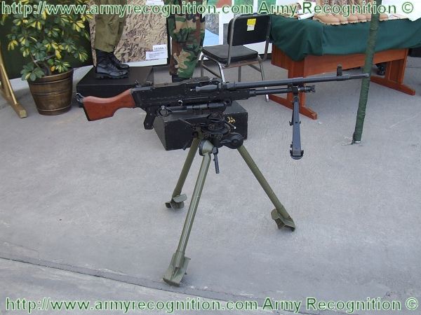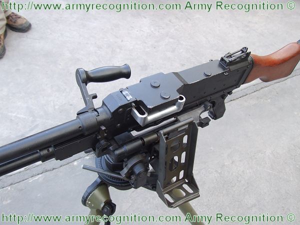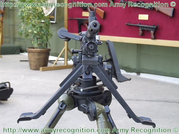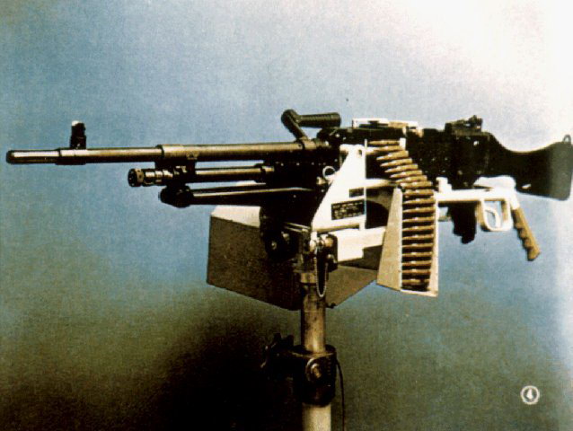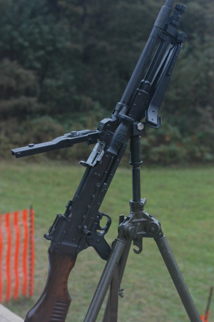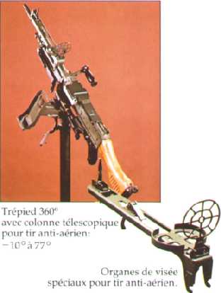 当作为重机枪使用时,则配用一个弹性(或叫柔性)三脚架,这种弹性三脚架可缓冲射击时的振动,减小点射时的散布面。使用时,把两根耳轴销插入机匣底部的环中,再把直推销插入扳机护圈上面的孔中,枪身即固定于三脚架上。 三脚架重10.5公斤, 最大火线高720毫米, 最小火线高254毫米。