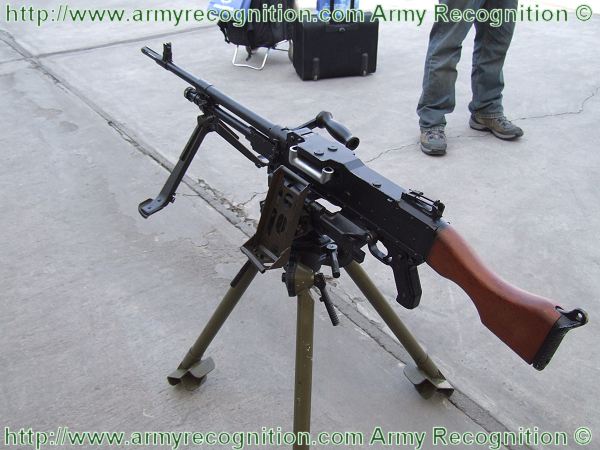 该枪的两脚架装在活塞筒的前端,架腿可以转动,使该枪能架在高低不平的斜坡上进行射击。携枪行军时,将两脚架向后折叠,架腿上各有一钩,分别卡入机匣两侧的凹槽中,由滑动的限定销固定。两脚架的方向射界为50°(880密位)。