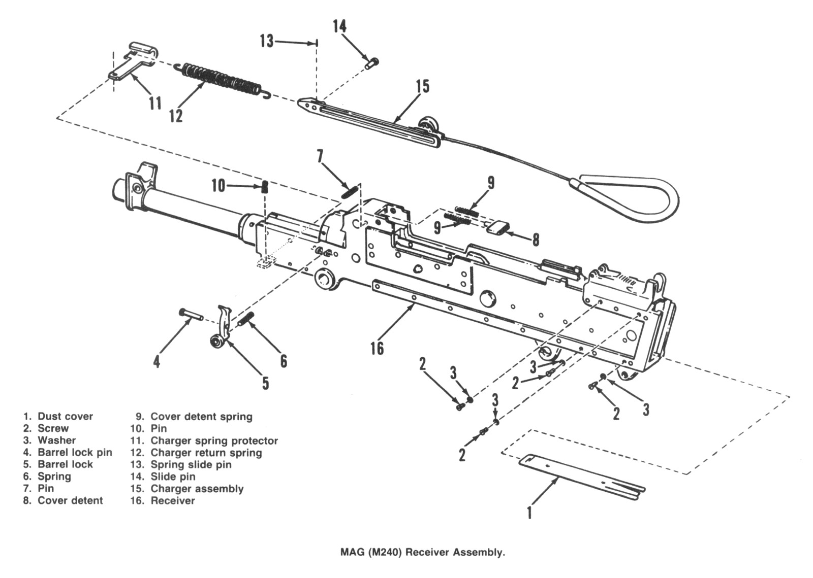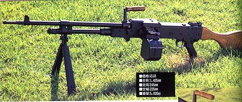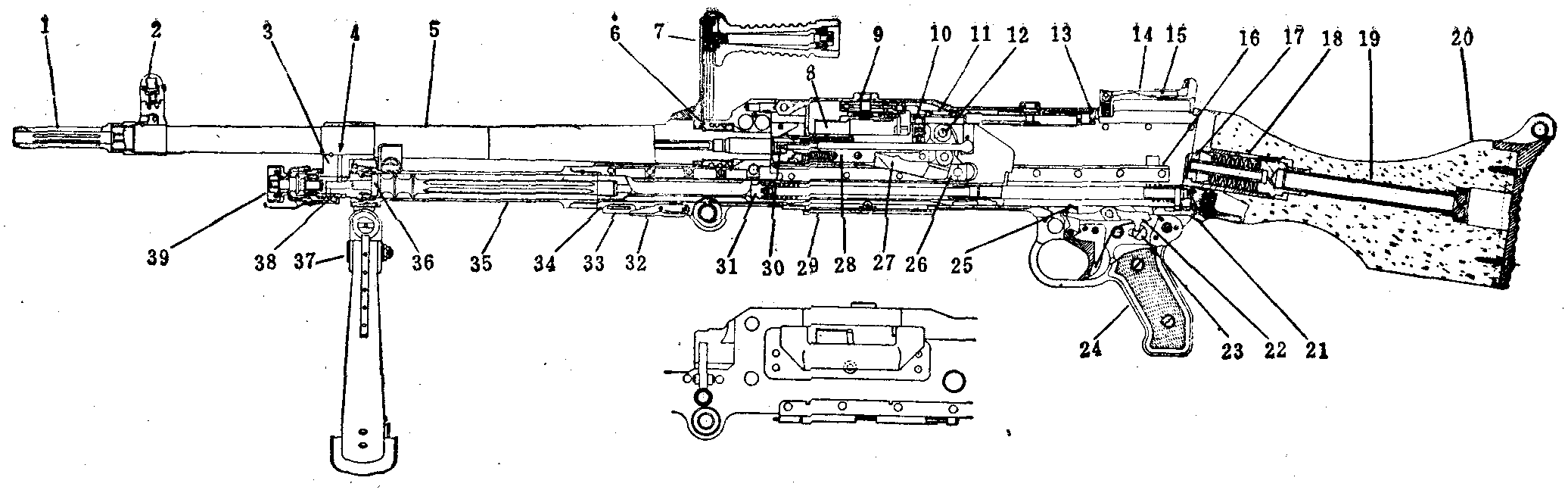 1-消焰器;2-准星;3-导气箍;4-导气孔;5-枪管;6-枪管节套;7-提把;8-阻弹齿;9-拨弹齿;10-枪机滚轮;11-拨弹杆;12-双臂杠杆;13-机匣盖卡笋;14-表尺座;15-表尺板(平放位置);16-枪机导轨;17-缓冲板;18-缓冲器;19-固定螺栓;20-枪托;21-枪托卡笋;22-阻铁;23-手动保险卡笋;24-握把;25-阻铁解脱杆;26-闭锁支承面;27-闭锁杆;28-枪机;29-抛壳口防尘盖;30-击针;31-活塞;32-两脚架限定销;33-机匣两侧两脚架的架腿槽;34-防尘盖;35-活塞筒;36-活塞头;37-两脚架;38-气体调节器气塞;39-气体调节器。