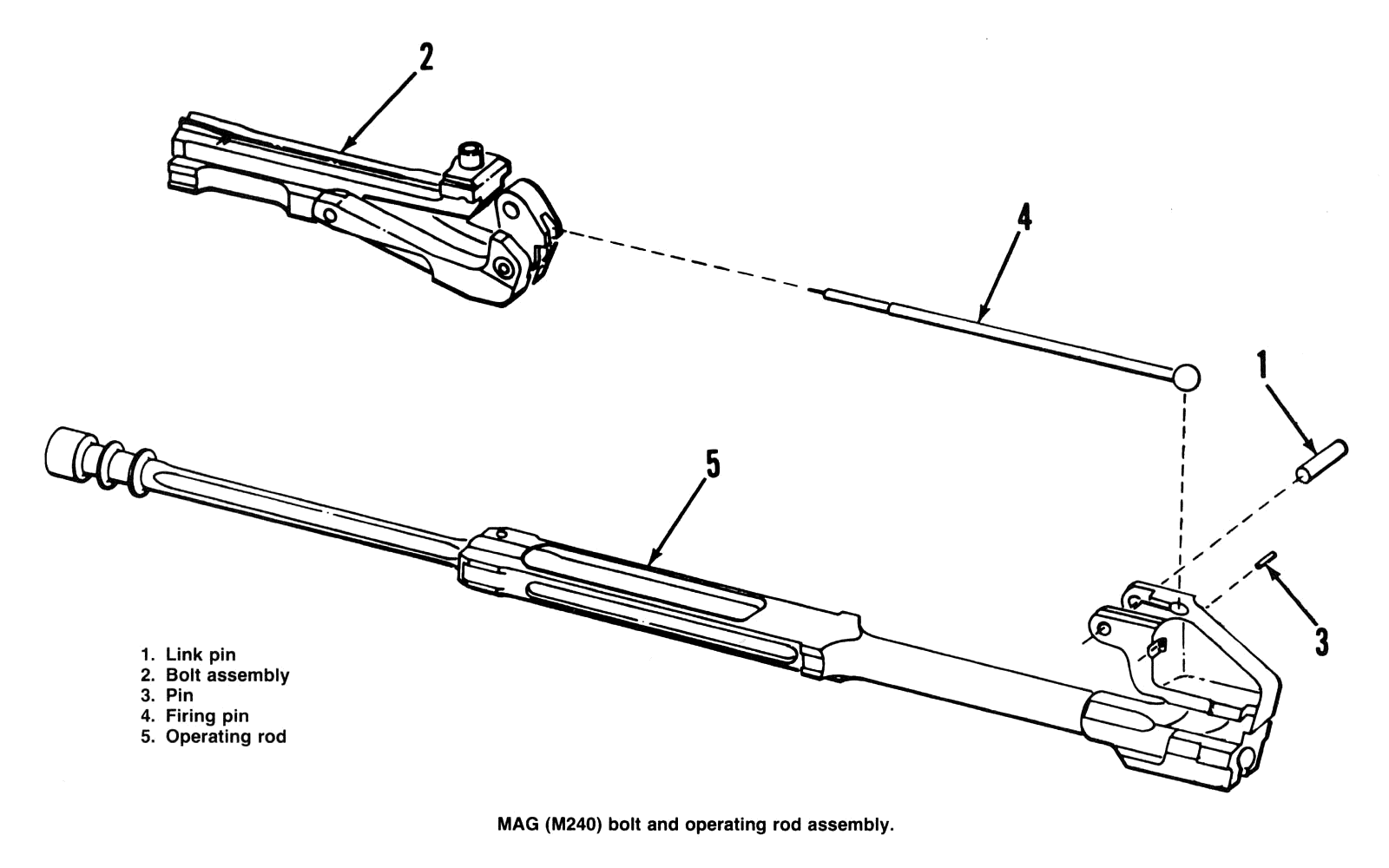由于MAG机枪采用长行程导气活塞原理,因此活塞、机框和枪机是一起运动的。活塞头上有三个闭气环,机框连接在截面为十字形的活塞杆上。机框前端有抛壳槽,后端是质量较大的击铁。枪机与机框前后的导棱与机匣导轨卡合。闭锁连杆的两端分别连接在击铁和闭锁杆上,闭锁杆用销轴固定于枪机中部。在枪机复进过程中,闭锁杆卡在枪机两侧的凹槽内,随枪机一并复进。枪机是中空的,击针孔内容纳击针,击针固定于击铁上,没有击针簧。复进簧装在机框的通孔中。