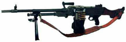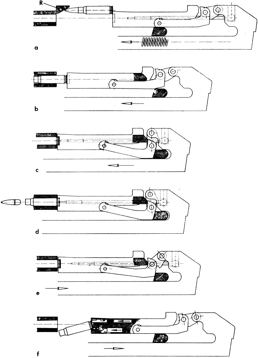 枪机后座时,拨弹杆在枪机滚轮带动下向左偏移,双臂杠杆则向右偏移。这就使内拨弹齿向内,带动弹链移动二分之一节距。至此,第二发弹便定位于阻弹齿上,准备入膛。而外拨弹齿则向外空回,准备拨取第三发枪弹。因此,在这种供弹机构中,内、外拨弹齿交替地起着拨弹和阻弹的作用,而使弹链在枪机复进和后座过程中各移动二分之一链距。 该枪采用开膛待击,向后拉动机柄装弹时枪机仍处在后方位置,把受弹器盖(机匣盖)向前打开成垂直。把弹链(开口向下)插入输弹口,使首发枪弹靠在右边的阻弹齿上,然后关上受弹器盖即可。打开保险便可发射。 扣压扳机时,阻铁头下降,在复进簧的推动下,机框带动枪机复进。枪机顶部的推弹凸笋把弹链上的首发弹直接推出,在进弹口导弹斜面的规正下,枪机推弹入膛。由于此时闭锁杆顶面撞击枪机导轨的底侧,故闭锁杆顶面被迫下降。枪弹完全入膛,拉壳钩卡入弹底环槽,弹底部置于枪机前端的弹底窝内。抛壳挺被压向后方,抛壳挺簧被压缩,枪机便停止复进。 枪机停止复进后,机框继续向前。同时,闭锁杆仍在下降,最后抵在机匣底部的闭锁支承面上。此后,由于机框复进,使闭锁连杆向下旋转而滑过垂直位置。在机框复进终了,击铁将长的击针自枪机中顶出,打击底火而击发枪弹。当活塞/机框组的斜肩撞击活塞筒的制动面时,机框的复进完全停止。 |