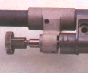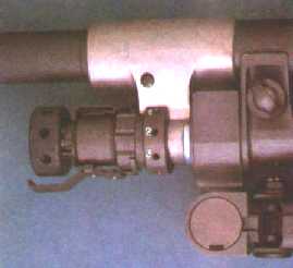 枪管与枪管节套是螺纹连接的,节套外表面有与机匣结合的断隔螺。枪管固定栓在机匣左侧,其作用是防止枪管节套松动。枪管提把的套箍卡在节套的凸缘上,转动提把,即将节套固定于机匣中。转动提把时,首先应将提把向前推,使枪管锁扣与节套解脱。由于在射击时,提把置于枪的右侧,不会影响瞄准。