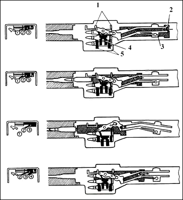 待发状态 1-阻弹齿;2-枪机滚轮;3-拨弹杆;4-内拨弹齿;5-外拨弹齿 |