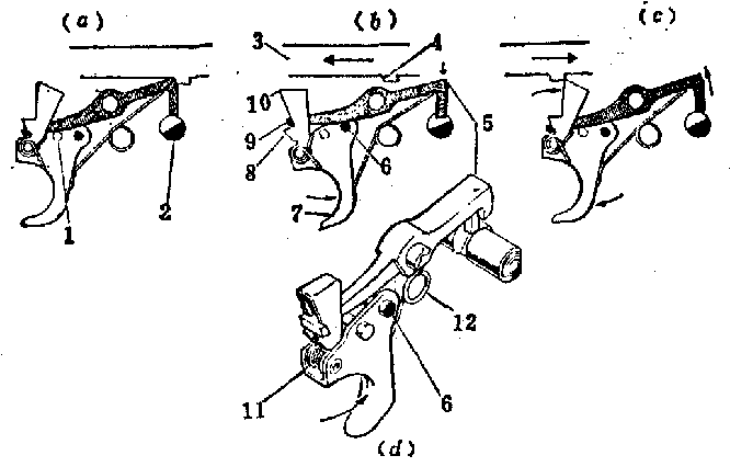 (d)发射机构图:1-扳机轴;2-手动保险卡笋;3-枪机;4-机框下突出部;5-阻铁头;6-定位销;7-扳机;8-凸齿;9-阻铁尾;10-解脱杆;11-扳机簧;12-阻铁簧