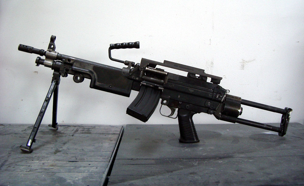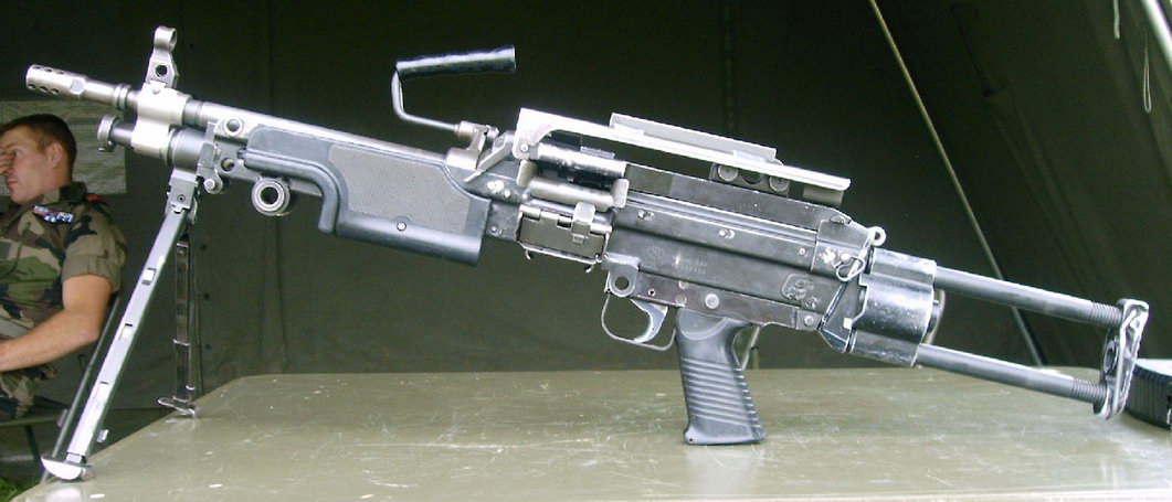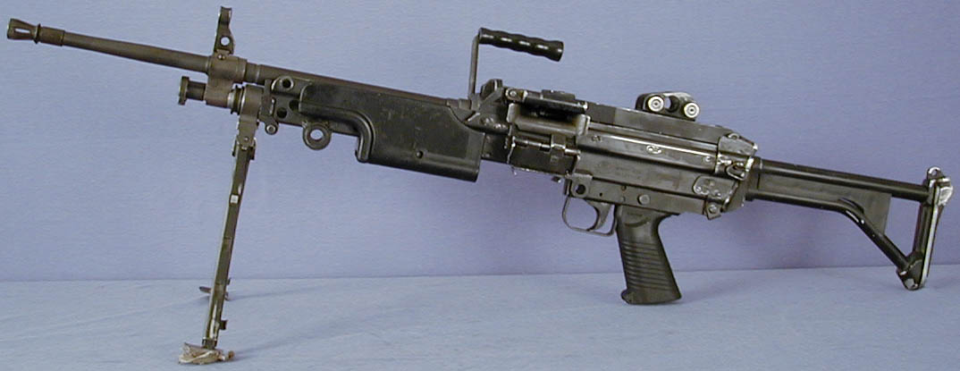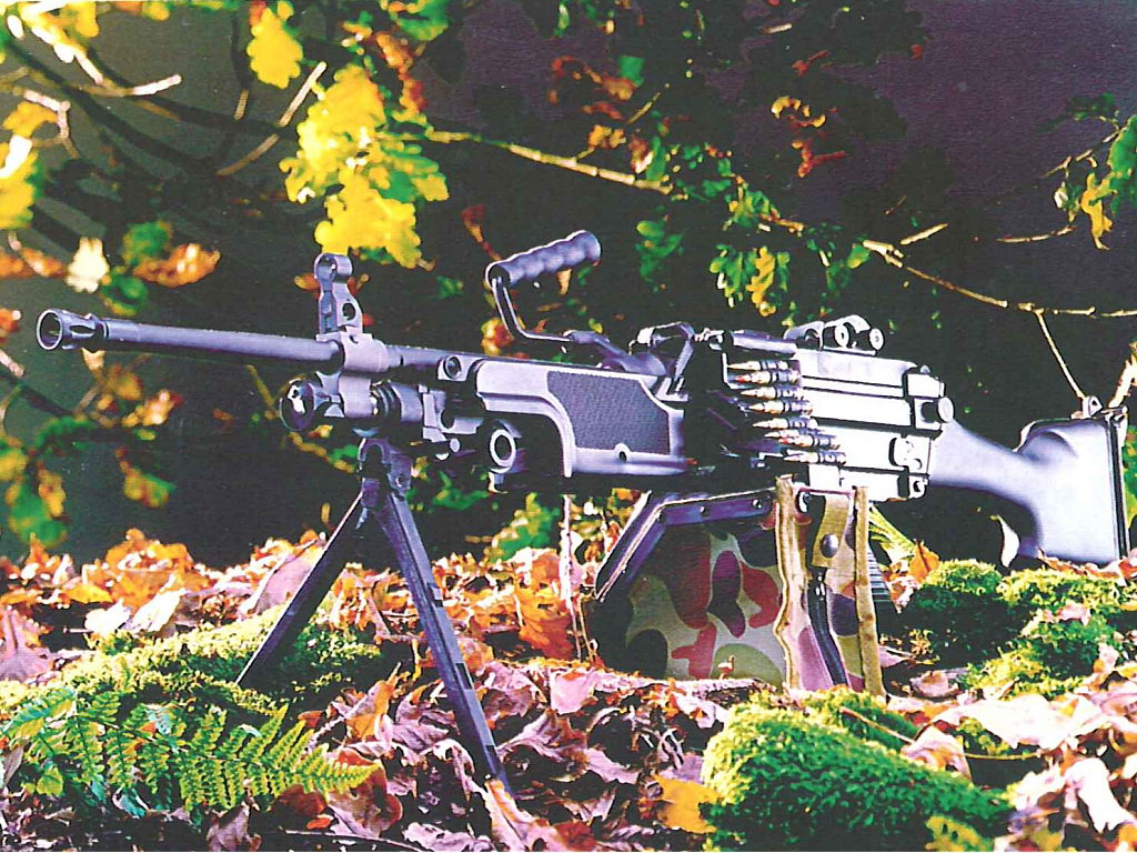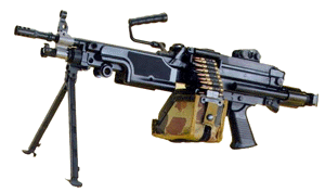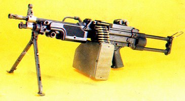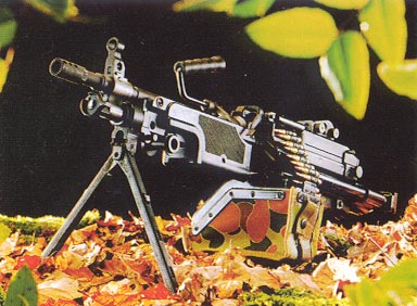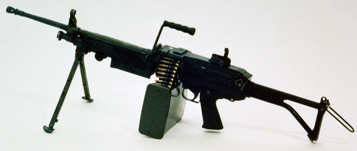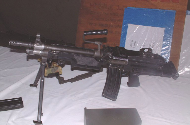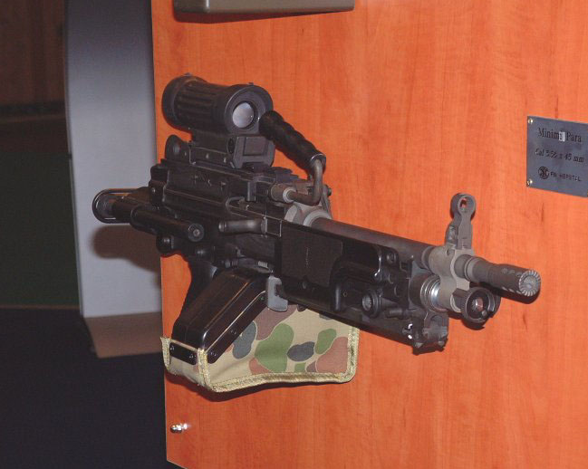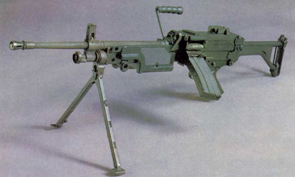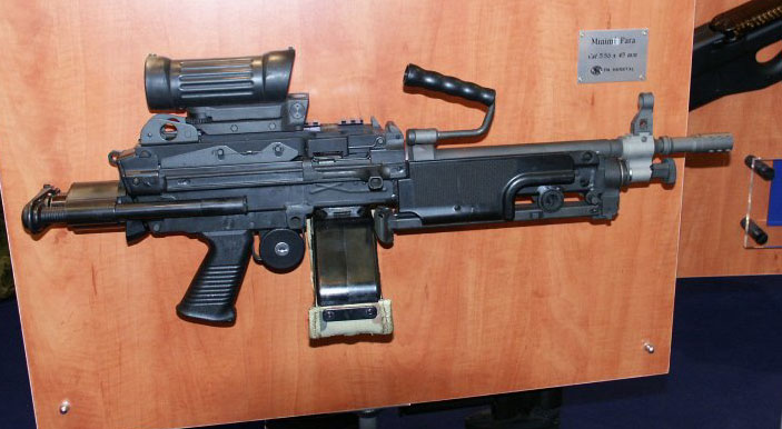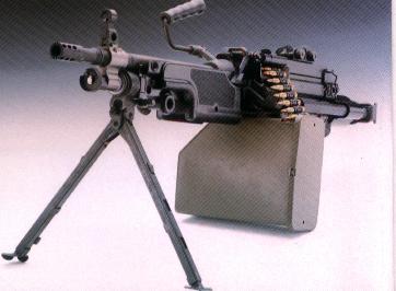 “米尼米”(Minimi)机枪是FN公司于1970年代初研制的机枪,是FN公司开发的第二种5.56mm NATO口径的轻武器,第一次公开露面是在1974年,其后参加了美国陆军班用自动武器(Squad Automatic Weapon,简称SAW)选型试验,在1977年与FNC一起参加了北约组织下一代步枪选型试验。1982年2月1日,美军决定采用Minimi(试验编号XM249)作为SAW型号,正式定名为M249 SAW,首先配发给美国陆军和海军陆战队的步兵作战分队。
