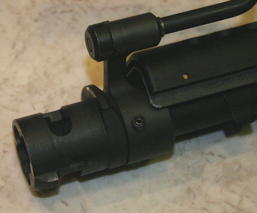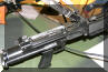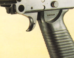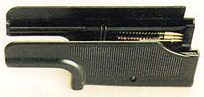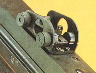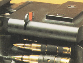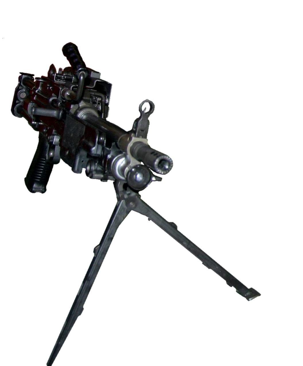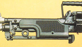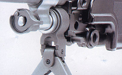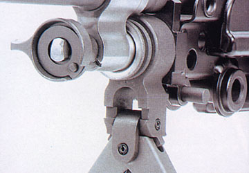 枪管靠凸轮定位,更换枪管很方便,用一只手捏住提把即可装卸枪管。 缓冲器和复进簧串联,并对准复进簧的后端。枪上装有击针保险和手动保险。