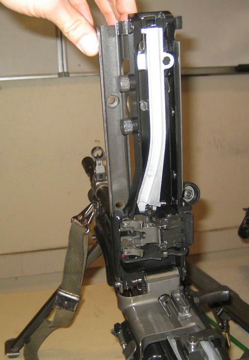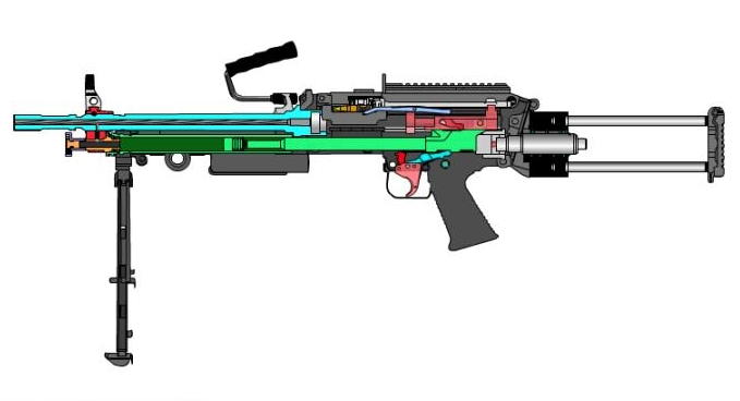 自动机是FN公司新设计的,开、闭锁动作由机框定型槽通过枪机导柱带动枪机回转而完成。由于枪机闭锁于枪管节套中,故可减小作用于机匣上的力。机框直接连接在活塞杆上,两者十起运动。机匣内侧的两根机框导轨起确保机框和枪管对正的作用。