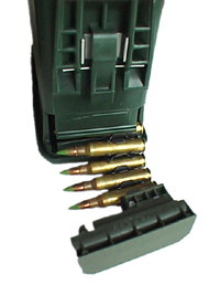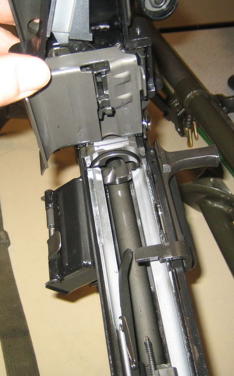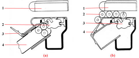 (a)将弹匣座的弹簧折叶盖板打开,即可用M16步枪的弹匣供弹,折叶上的凸齿起弹匣卡笋的作用。(1-机匣盖,2-枪机,3-弹匣座的弹簧折叶盖板,4-步枪弹匣)