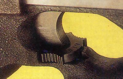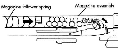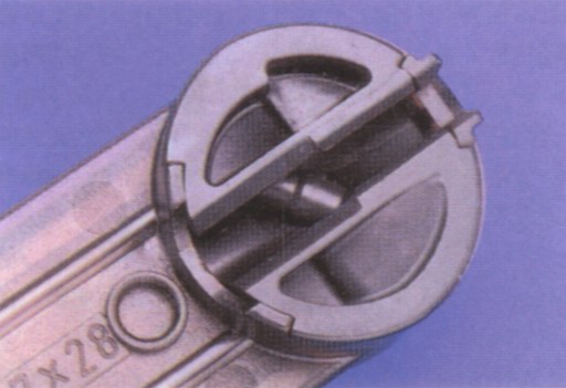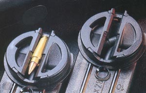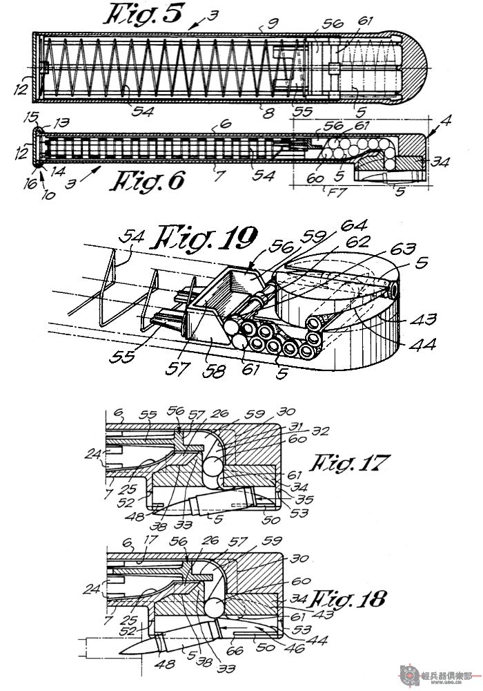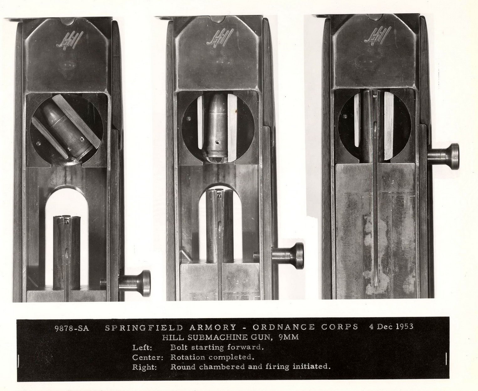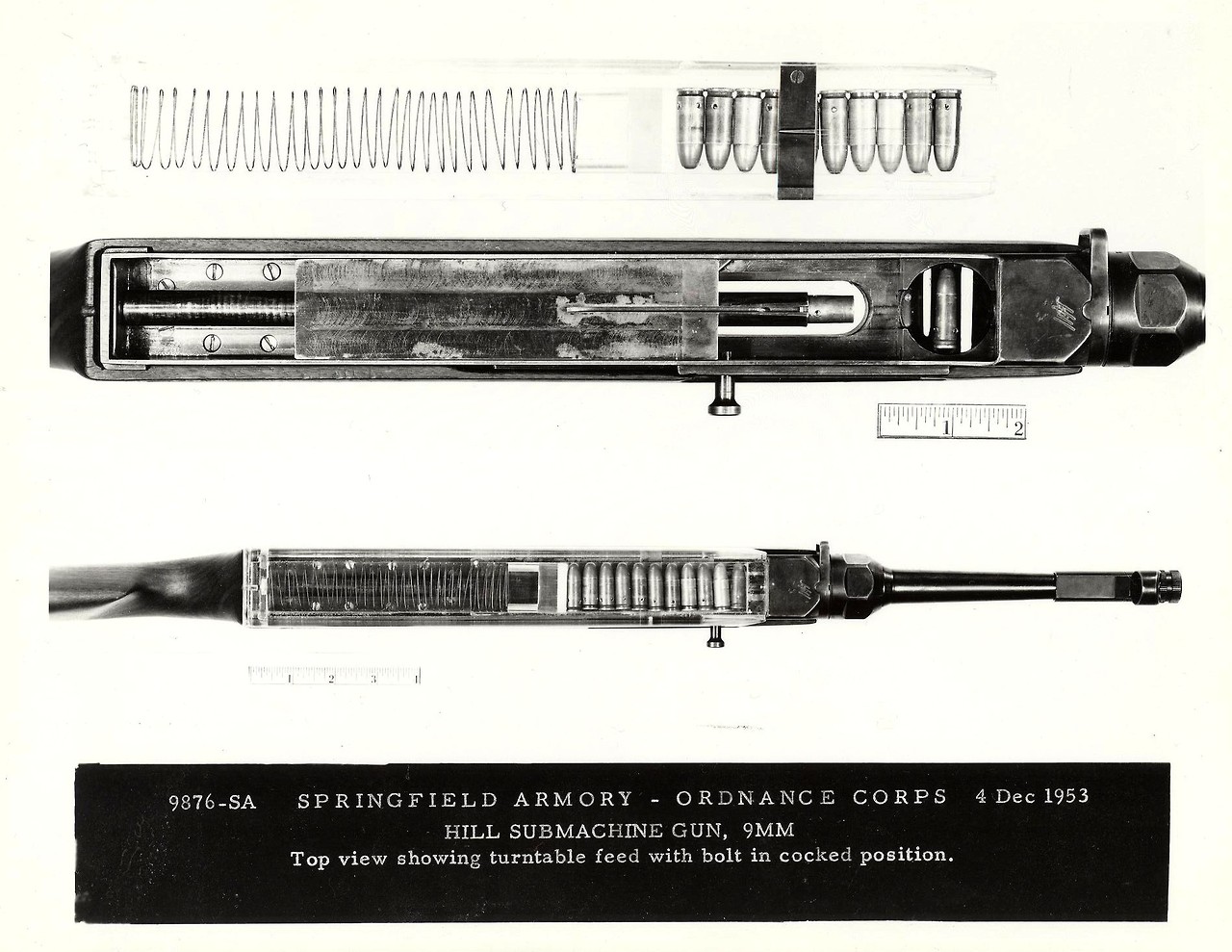 不过这种让枪弹平行置于枪管上方且与枪管轴线垂直交错的弹匣并不是FN公司首创的,早在1950年代初,美国就研制了一种名为希尔(Hill)的9mm口径冲锋枪,就已经采用了这样的供货供弹系统。但希尔冲锋枪的供弹方式要复杂一些,在枪机向后运动时,通过一根弹簧带动一个托弹转盘回转90度,使枪弹与弹膛对正,然后枪机复进时把托弹转盘上的待发弹推进弹膛。而P90则没有这样的活动部件,而是直接通过旋转的输弹槽让枪弹转向90度。