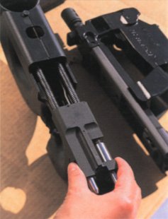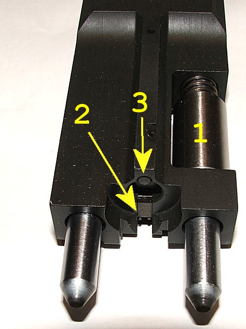 枪机:1-射速缓冲器,2-拉壳钩,3-顶壳杆