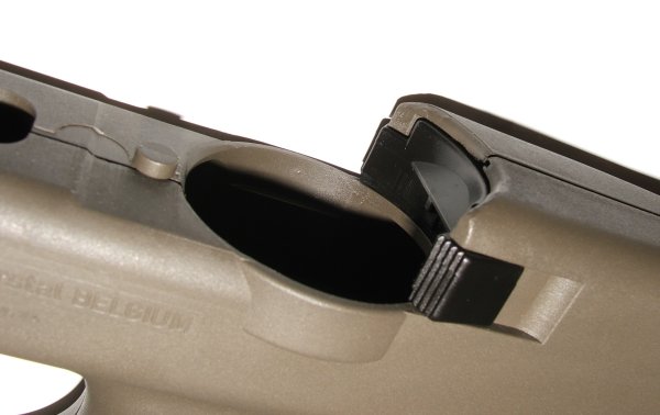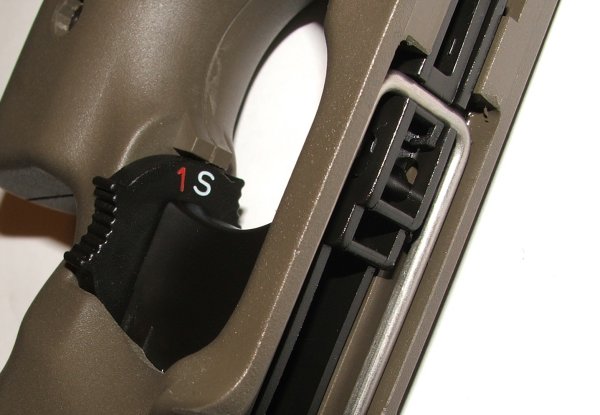 P90的快慢机位于扳机下方,有“A”、“I”、“S”三个位置,分别代表全自动、半自动和保险。由于快慢机的位置和形式,用扣扳机的手指都可以很方便地控制。