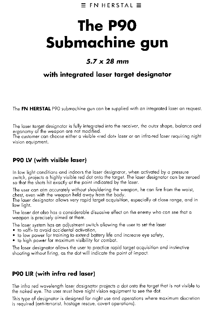 | 早期的FN P90宣传片,特别强调适合非一线战斗人员使用 | ![]() |