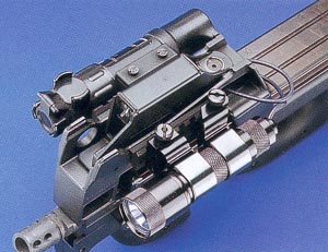 这支P90 LV的瞄具两侧安有RIS导轨,在瞄具后方附加了一个光学瞄具,看起来像是个夜视装置。在抛壳口下方还挂有一个迷彩色的弹壳收集袋。