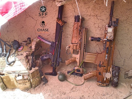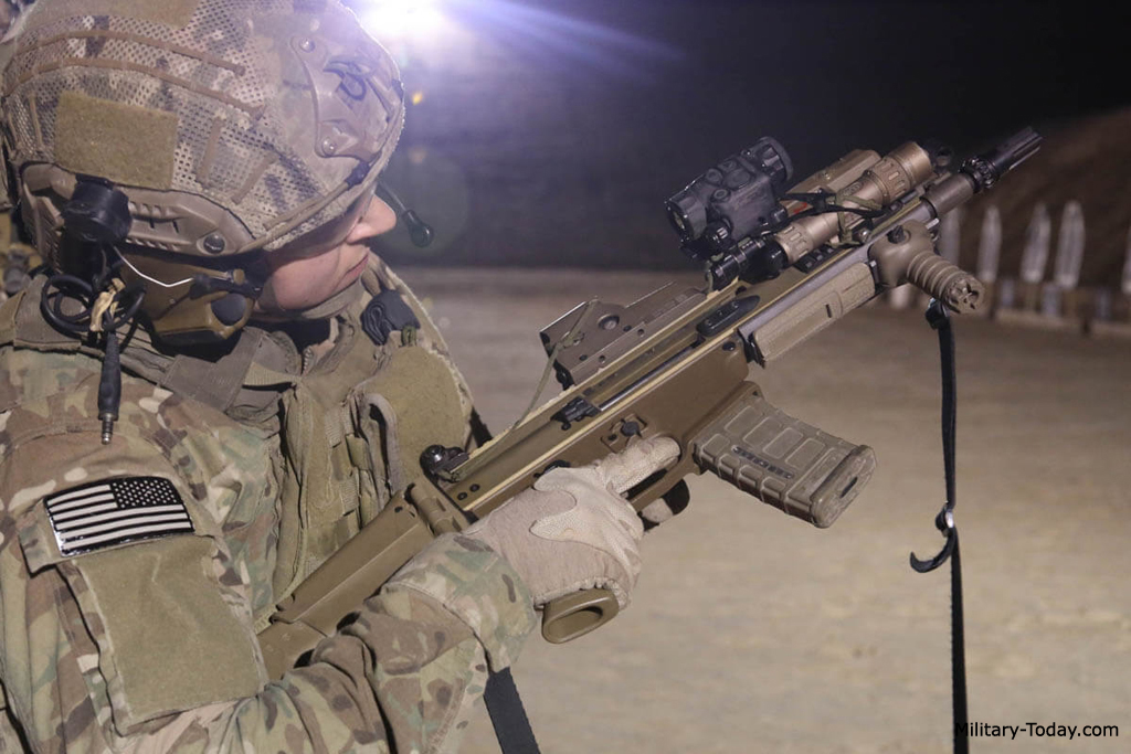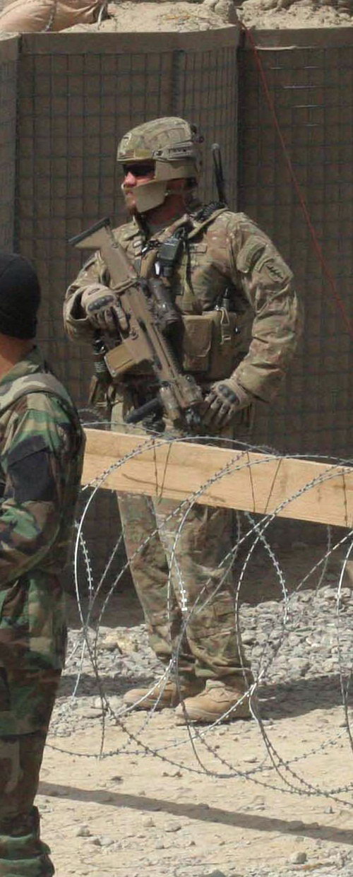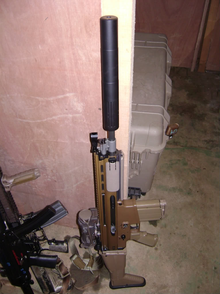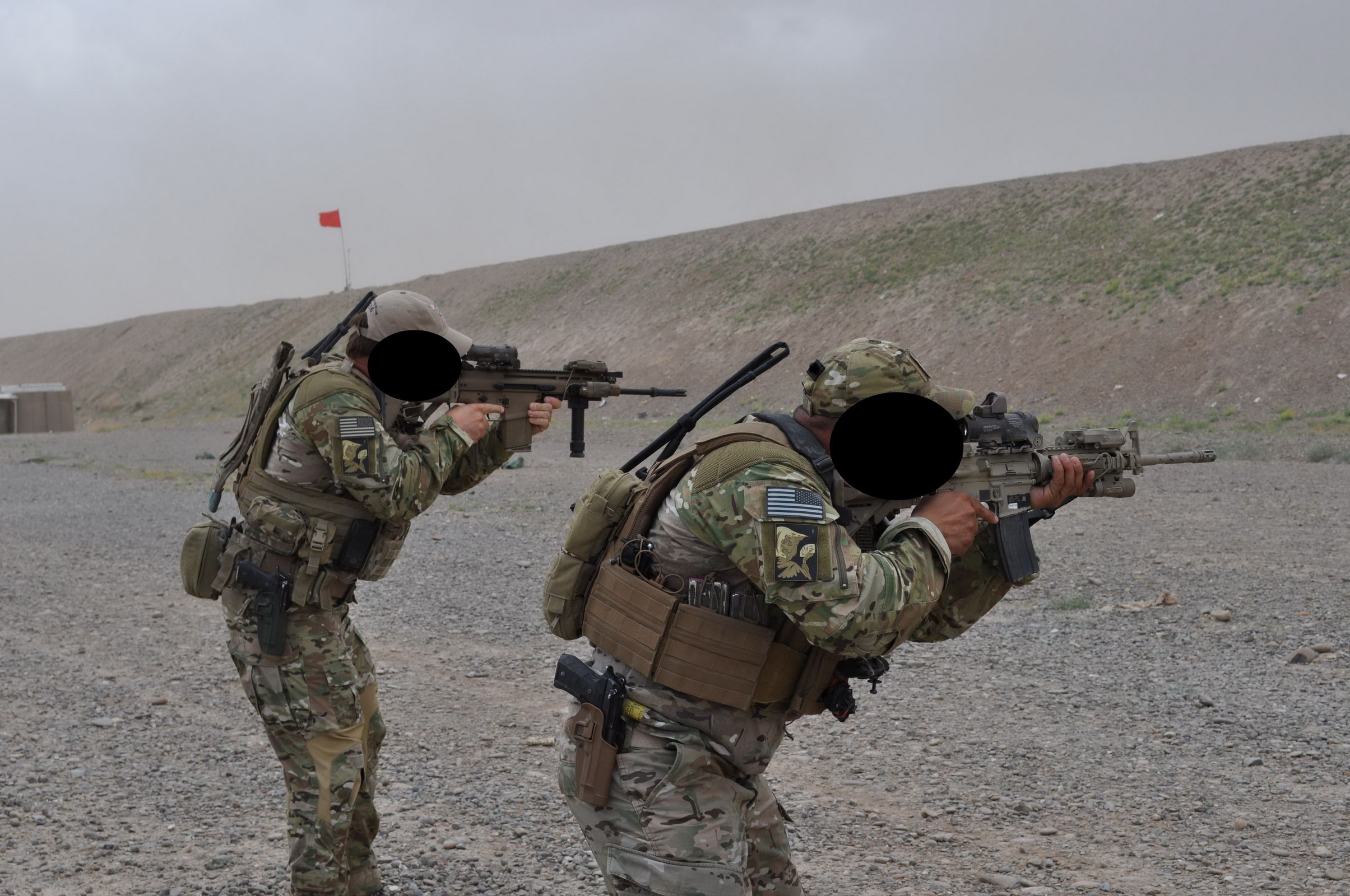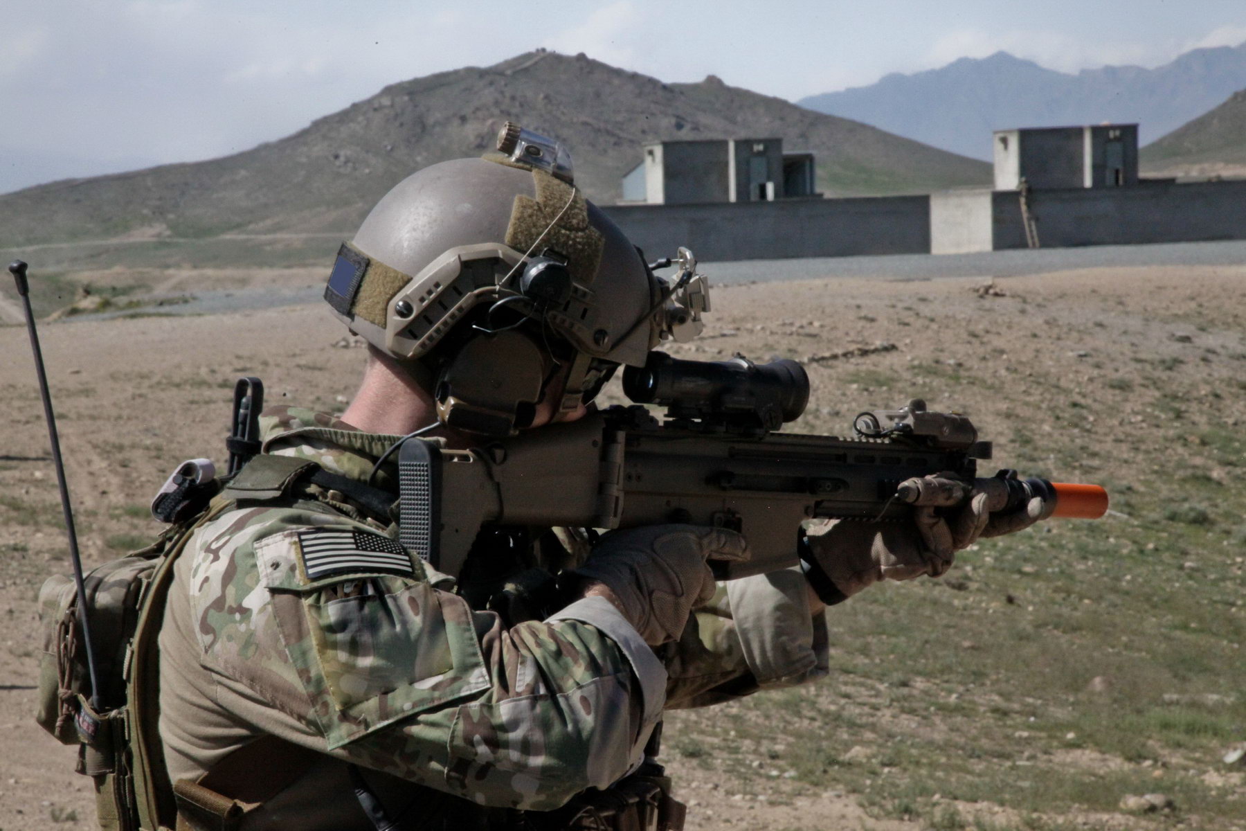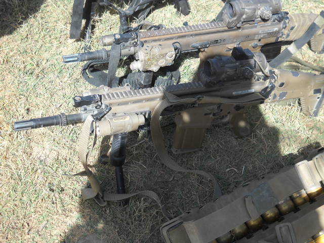 较少见的实际使用中的SCAR的空包弹助退器,这是2013年4月28日在喀布尔进行演习的美国陆军特种部队