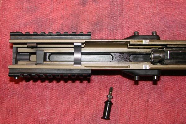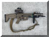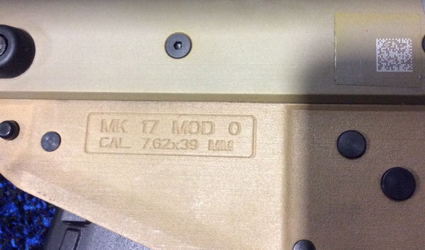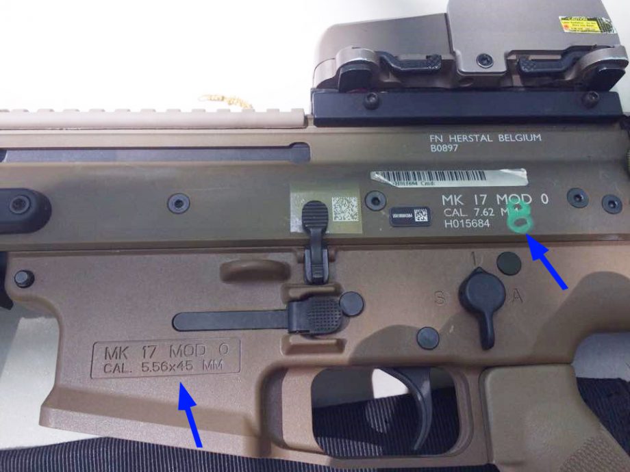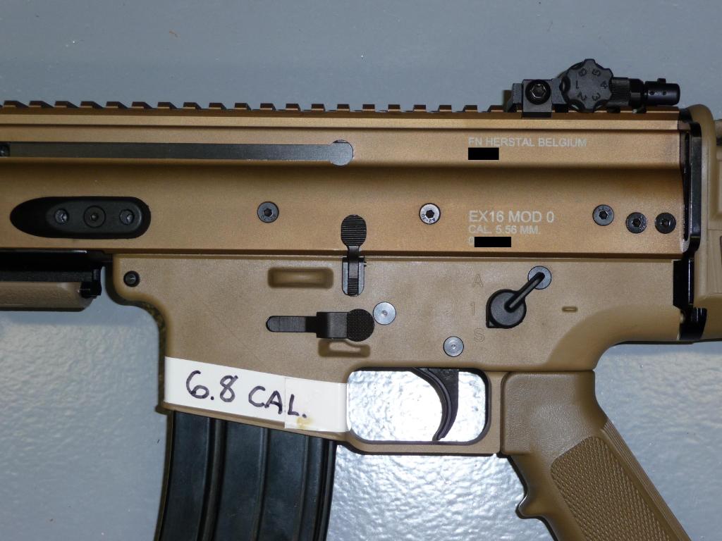 注意这把贴了标记的枪,虽然上机匣的铭文是标着5.56mm,但据说是6.8 SPC口径的试验型