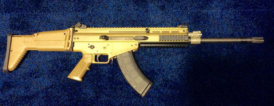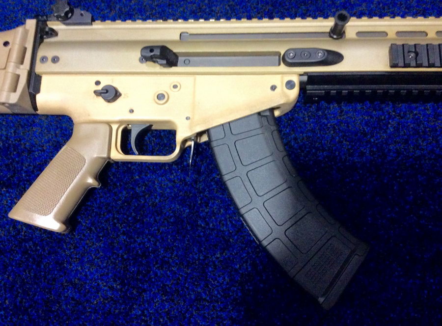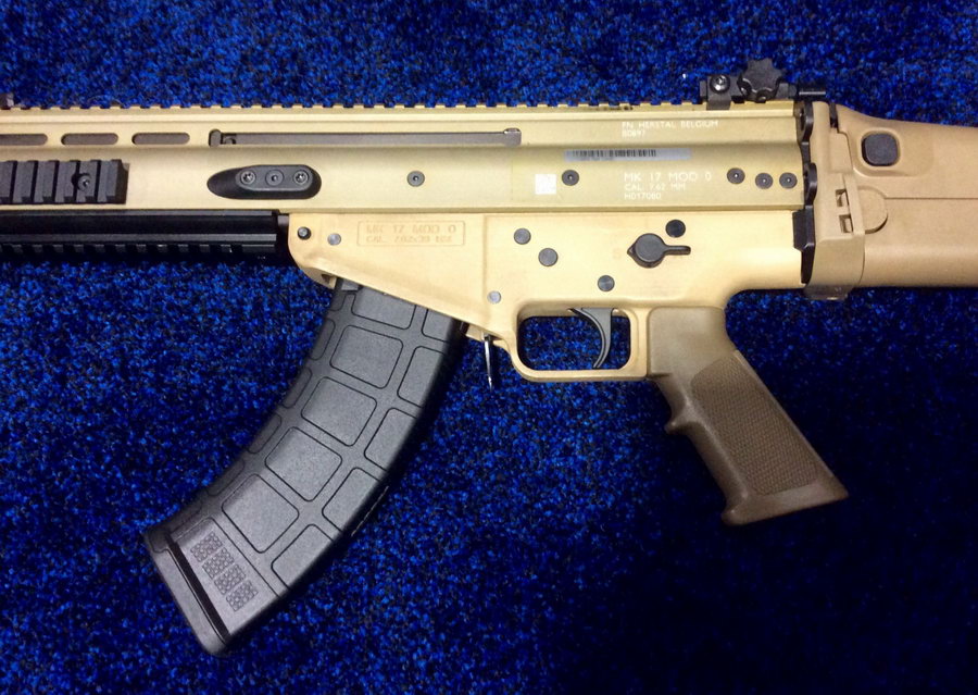 前面提到,FN SCAR项目一早就有提到要研制7.62×39mm口径的型号,但FN公司却一直没有推出这个型号,因此在民间有玩家或造枪小企业(作坊)提供此类改装服务。直到2015年10月,FN公司终于正式展出了他们自己生产的7.62×39mm口径的SCAR,这是以Mk17 SCAR-H的上机匣,安装一个可以直接使用AK弹匣的下机匣,并更换枪管、枪机等部件组成。因此就跟5.56mm口径的通用下机匣一样,只要更换一些部件,就可以把现有的Mk17改装成发射7.62 M43弹的步枪,而且据说还能直接通用AK的弹匣。