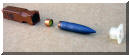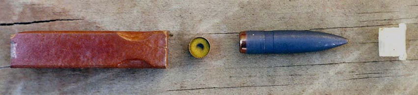 上面的图片是G11无壳弹的第一个原型,弹头下半部嵌入模压而成的发射药柱内,颗粒状的发射药清晰可见。最初的口径为4.3mm(左图),后来口径改为4.9mm(右图)。