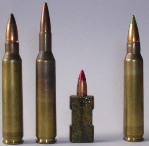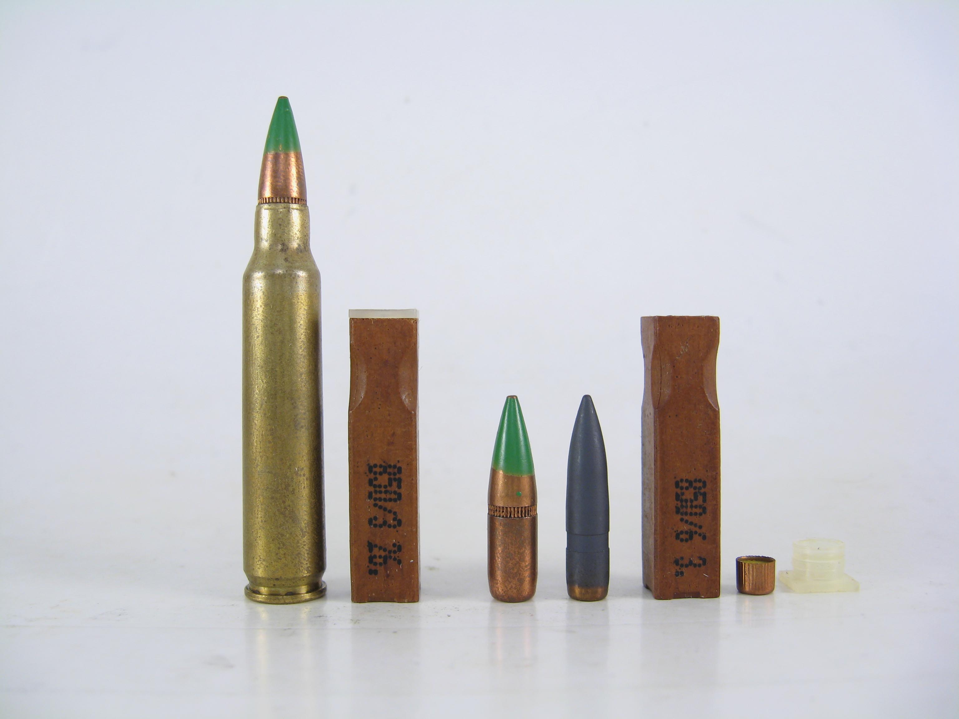 从左到右为:5.56 XM777,GBR 4.85mm,DEU 4.7mm无壳弹,5.56 M855