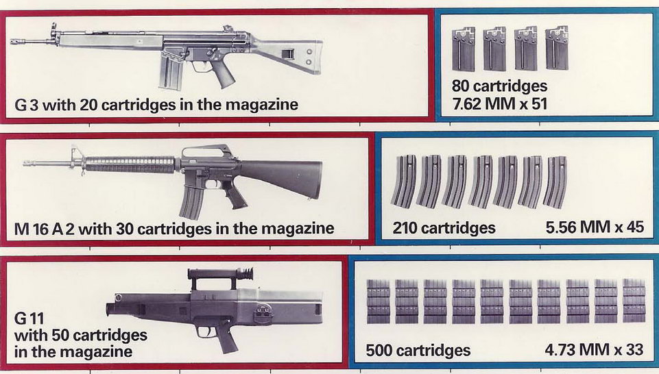 DM11无壳弹的体积和重量比一般的有壳弹小。一名配备G11无壳弹步枪的士兵在G11步枪上带弹90发(两个弹匣),另外携带28个15发封装的弹包,一共可携带510发,加上枪总重量为16.2磅。在相同的携行重量下,配备M16A2的士兵只能携弹240发,而配备G3A3的士兵则只能携弹100发。