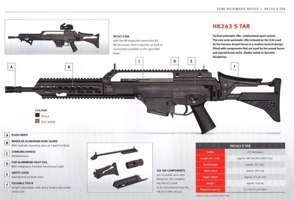 HK243/293都有SAR和TAR两种型号。SAR型(半自动步枪——Semi-Automatic Rifle)配普通的G36聚合物护木,只有机匣顶部有聚合物制成的皮卡汀尼导轨;TAR型(战术自动步枪——Tactical Automatic Rifle)不但顶部的导轨是铝合金,而且护木也是铝合金导轨护木,枪托也换成G36最新的全可调枪托。