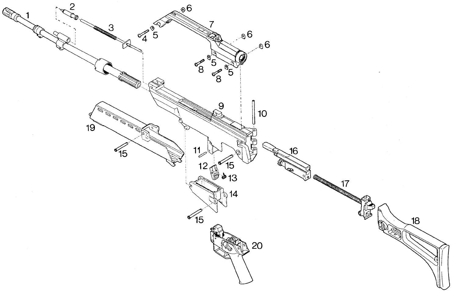 | 10 | 枪托转轴 / Roll pin | 20 | 握把组件 / Pistol grip, compl. |