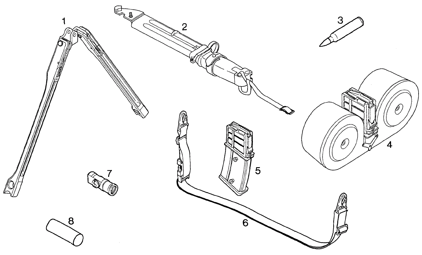 | 3 | 教练弹 / Dummy cartridge, cal. 5.56mm | 7 | 空包弹发射器 / Blank firing attachment for G36E and MG36E |