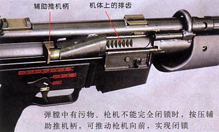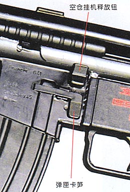 G41使用M16的通用弹匣,这点与HK33E不同,而且抛壳口上还有一个防尘盖。